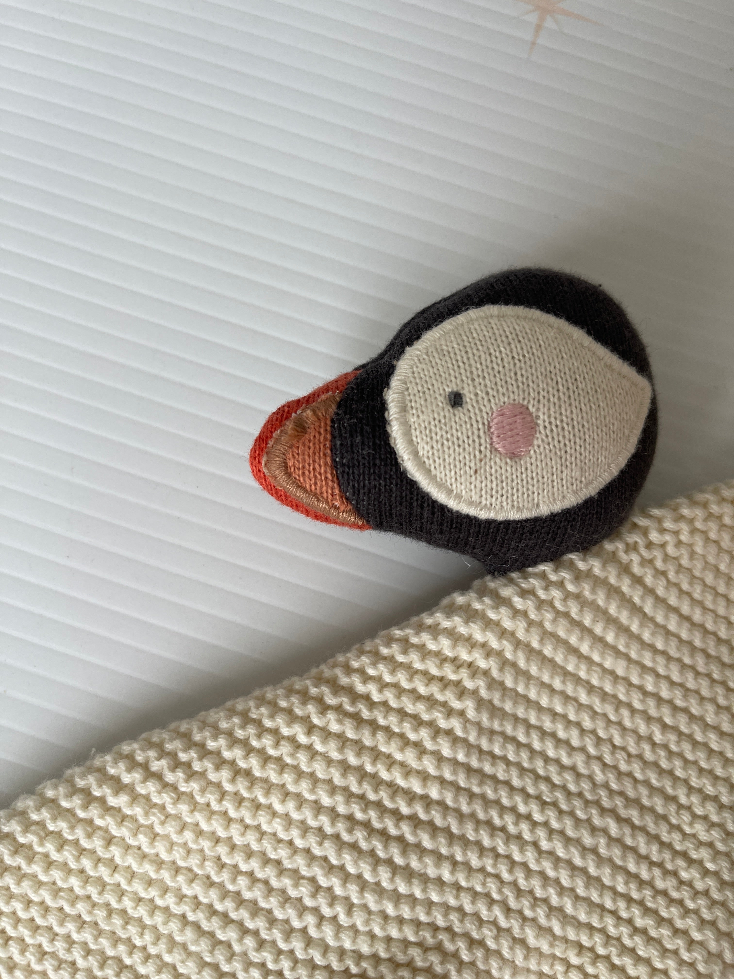 Meet your little one's first friend, our Cuddle Cloths. This sweet Patient Puffin has been designed for little hands to grip and squish, and the scallop edge knitted cloth is perfect for snuggling.