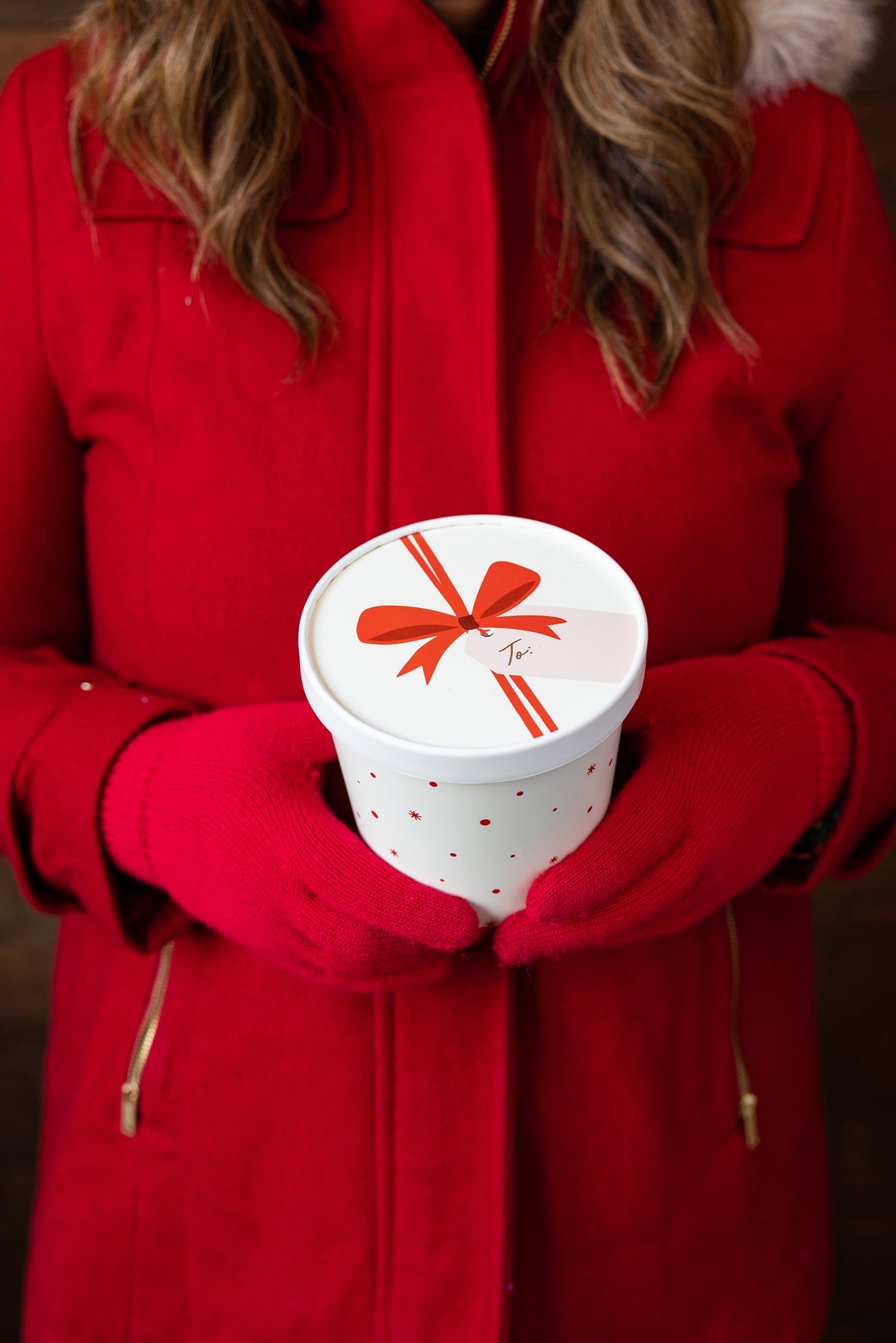 Spread holiday spirit to loved ones and neighbors with these present treat cups. These treat cups include lids, so they are perfect to deliver your favorite Christmas goodies around the neighborhood, or send love ones home with holiday leftovers after the merriment is over at your Christmas party.