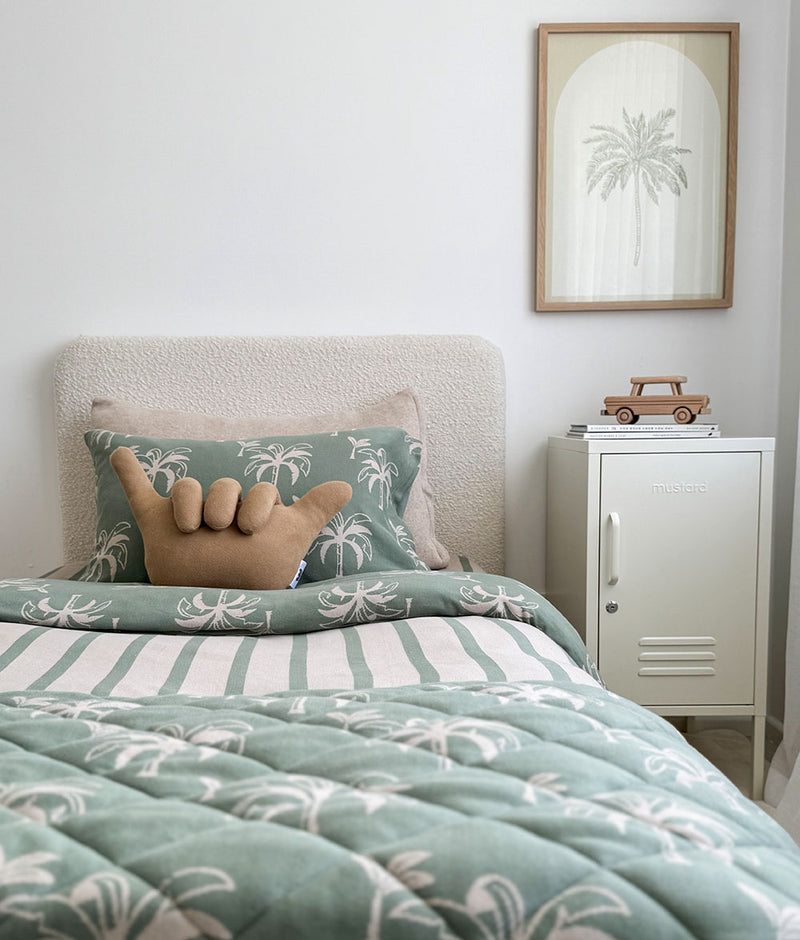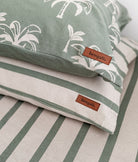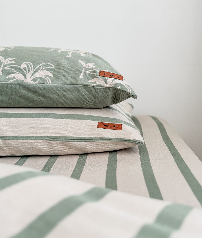 Mineral Green pillowcase with a subtle Greige Palm detail and a plain mineral reverse. Woven from 100% pure cotton, it’s soft, breathable, and designed for everyday comfort across every season.