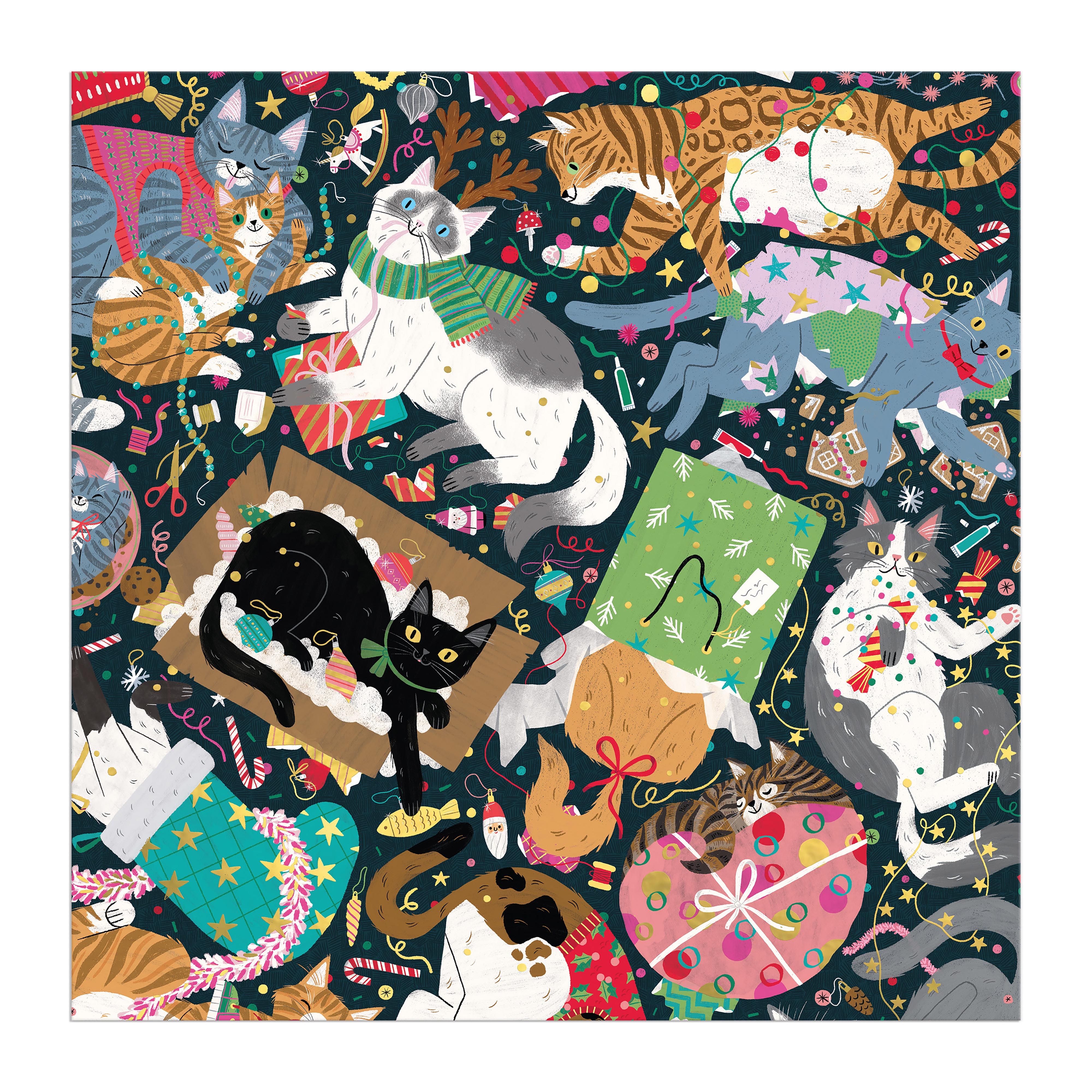 This puzzle features a myriad of cats amidst a chaotic Christmas mess! The puzzle is enhanced with sparkling gold foil details.