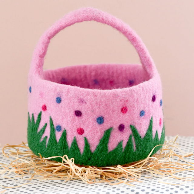Make this Easter egg hunt extra special with our adorable felt pink basket adorned with colourful dots and wavy grass! Perfectly sized for little hands and brimming with charm, this basket is an essential accessory for your Easter festivities.