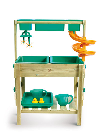 INCLUDES 13 ACCESSORIES: This play table includes 2 cups, 2 tanks, 2 lids, 2 water basins, 1 windmill, 2 S-shaped channels and 2 ducks!