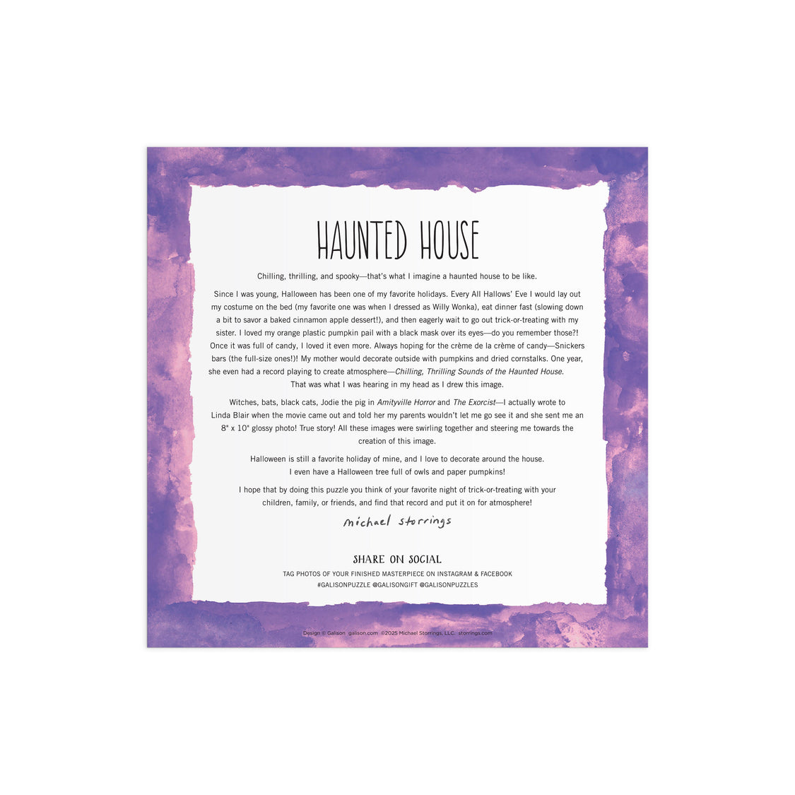 500 PIECE PUZZLE – Michael Storrings Haunted House 500 Piece Glow in the Dark Puzzle by Galison features a fun haunted house scene for Halloween.