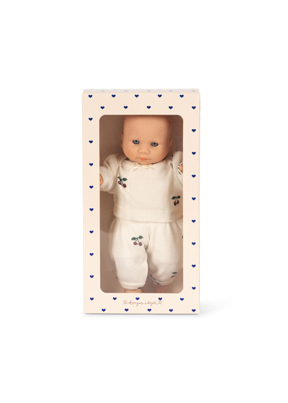 The squishy little doll has a soft body with cherry printed fabric and is dressed in a two-piece cotton set. The doll comes in a sweet little gift box.