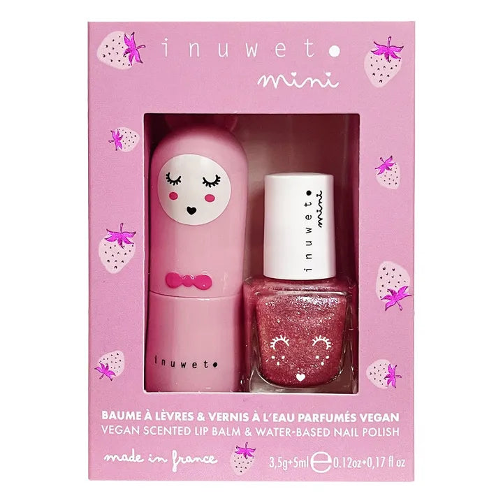 A perfect duo to delight children from 3 years old. Strawberry lip balm and Strawberry polish Enriched with shea butter and macadamia oil, these balms effectively nourish, repair, and protect the lips. The icing on the cake: the formula of both products is vegan, cruelty-free, and free of parabens and allergens. Made in France with love. Moisturizing Lip Balm: Sweet Strawberry Scent A strawberry lip balm and a sparkly nail varnish Enriched with shea butter and macadamia oil, these balms effectively nourish, repair, and protect the lips. Both products are vegan, cruelty-free, paraben and allergen-free.