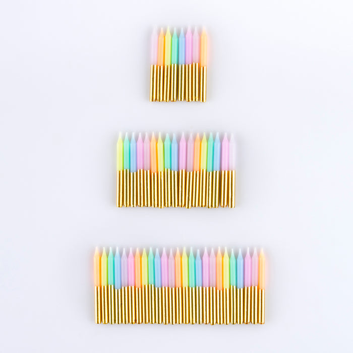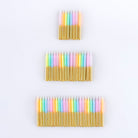 Dim the lights, a rainbow of colors is here! Let everyone know it's a special birthday with this wonderful display of mini birthday candles. Pastel perfection mixed with elegant gold. Place them all, or just a mix, on the birthday cake, depending on the effect you want to achieve. An ideal candle set to keep in your store cupboard, ready to brighten up any sweet treat in seconds. They also look great on cupcakes, and make a fabulous host gift too.