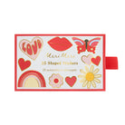 Style up Valentine's with this colorful, retro-cool sticker set. Featuring 13 groovy '70s inspired designs, ideal to add a little love to creative moments. Perfect to decorate party bags, party invitations, gift tags, notebooks or posters, or to give creative flair to your Valentine's day party activities. Beautifully presented in a matchbox-style box with a red ribbon pull loop, they make a charming gift or party favor for kids who enjoy sticking, sharing and getting crafty. Suitable for ages 3+.