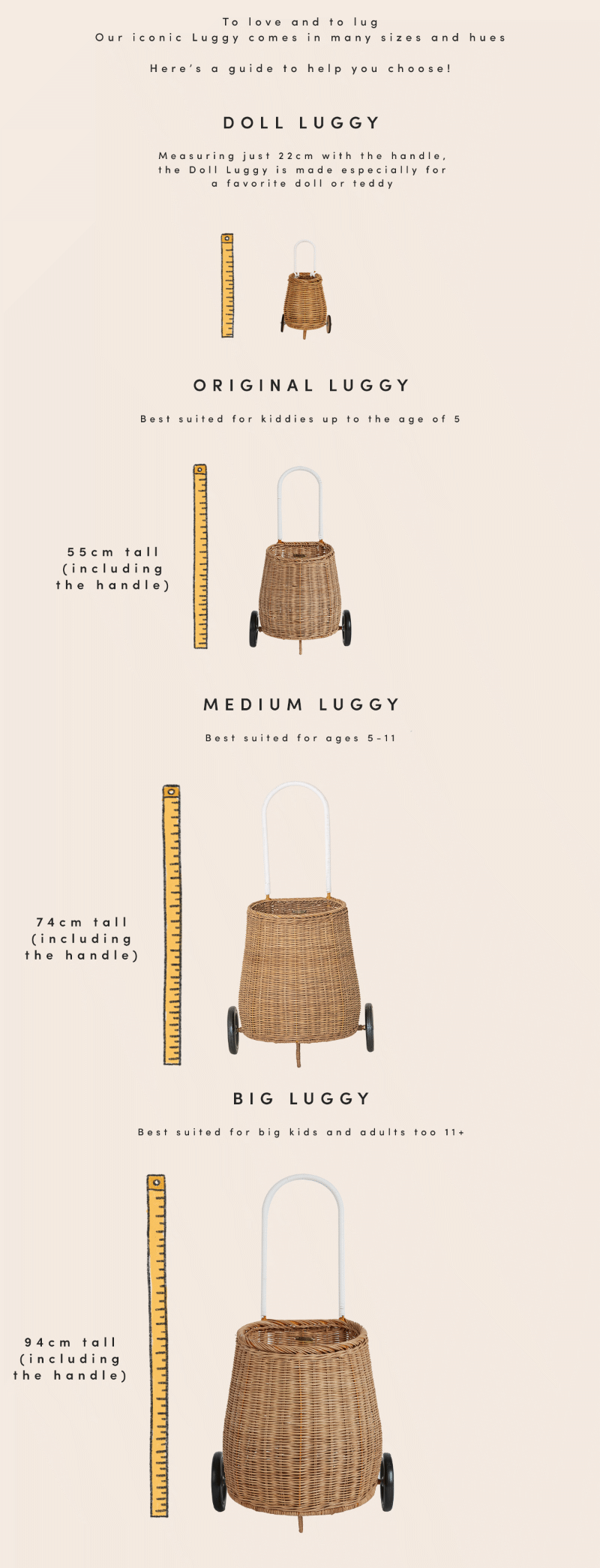 A tiny wheeled basket for your toddler, perfect for storing and toting their most prized possessions. The Luggy Basket will go with your child everywhere from the beach to the playground or for helping you with the weekly food shop! We ❤ the Luggy!