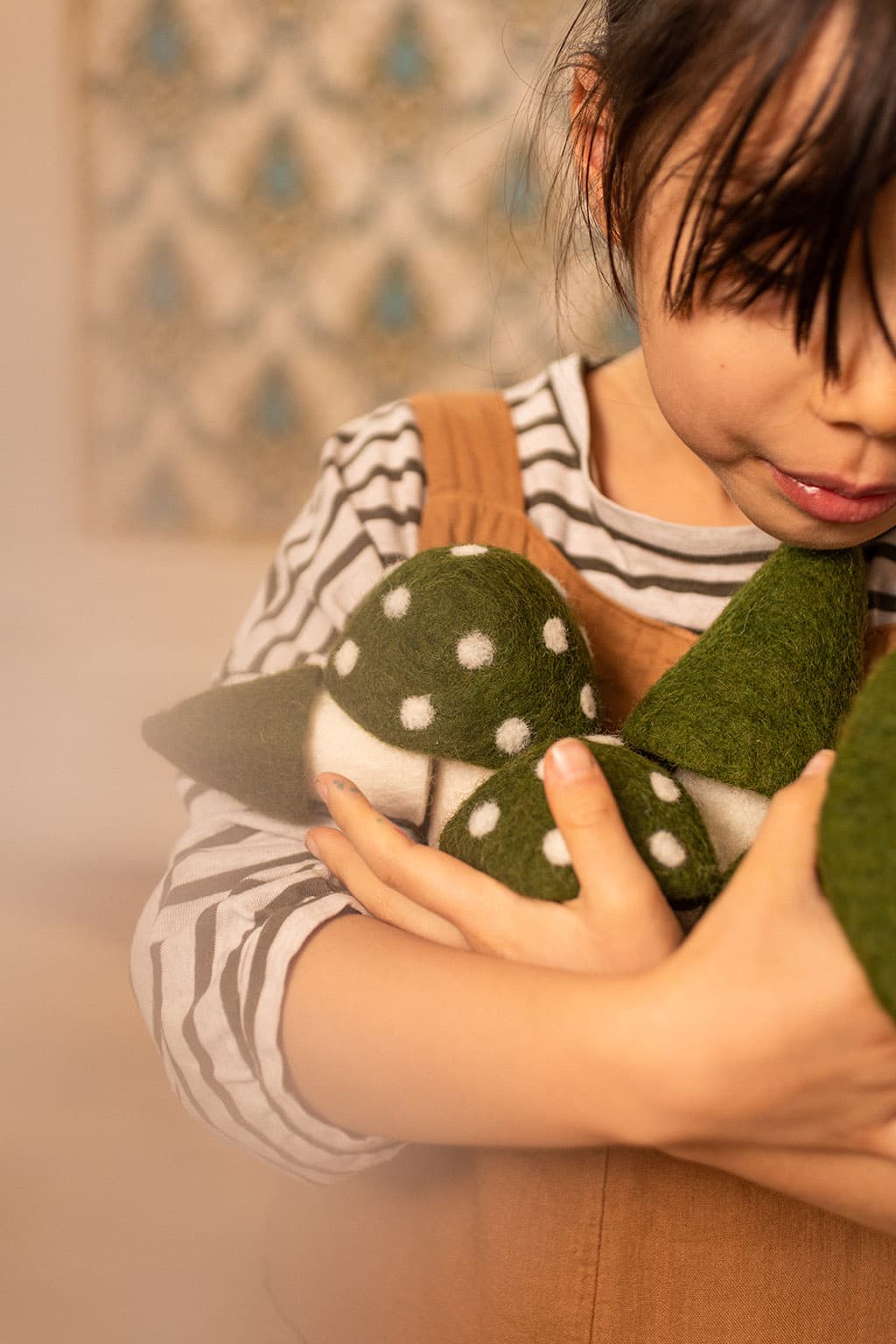 The felt Mushroom is the star of the collection, a must-have in the home! Whimsical and fun, a decorative touch the whole family will enjoy. The mushrooms are cute in children's bedrooms, in the library, or on top of a dresser or occasional table.