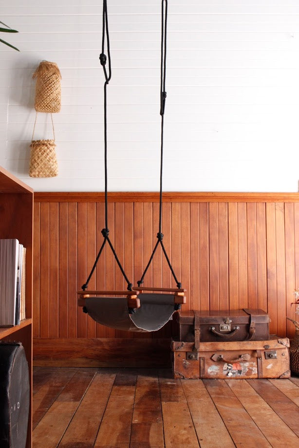 There are many choices for hanging your swing either indoors or outdoors. You will need to be sure that the point of hanging is strong enough for the weight to be used in the swing and there is enough space around the swing for it to operate safely. With the appropriate hardware your swing may be hung from timber, concrete or a tree. Popular choices are inside from the ceiling, verandas, pergolas, trees and existing swing frames.