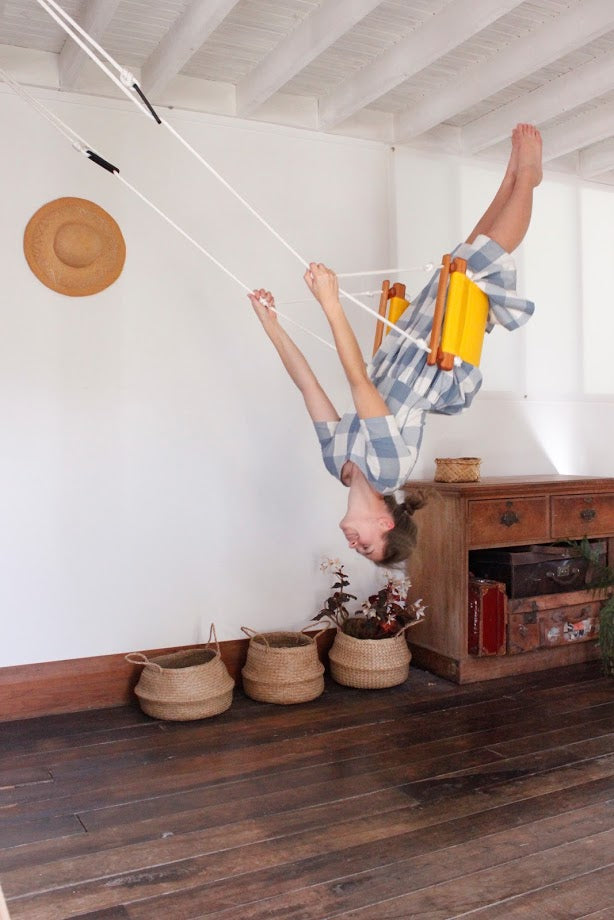 There are many choices for hanging your swing either indoors or outdoors. You will need to be sure that the point of hanging is strong enough for the weight to be used in the swing and there is enough space around the swing for it to operate safely. With the appropriate hardware your swing may be hung from timber, concrete or a tree. Popular choices are inside from the ceiling, verandas, pergolas, trees and existing swing frames.