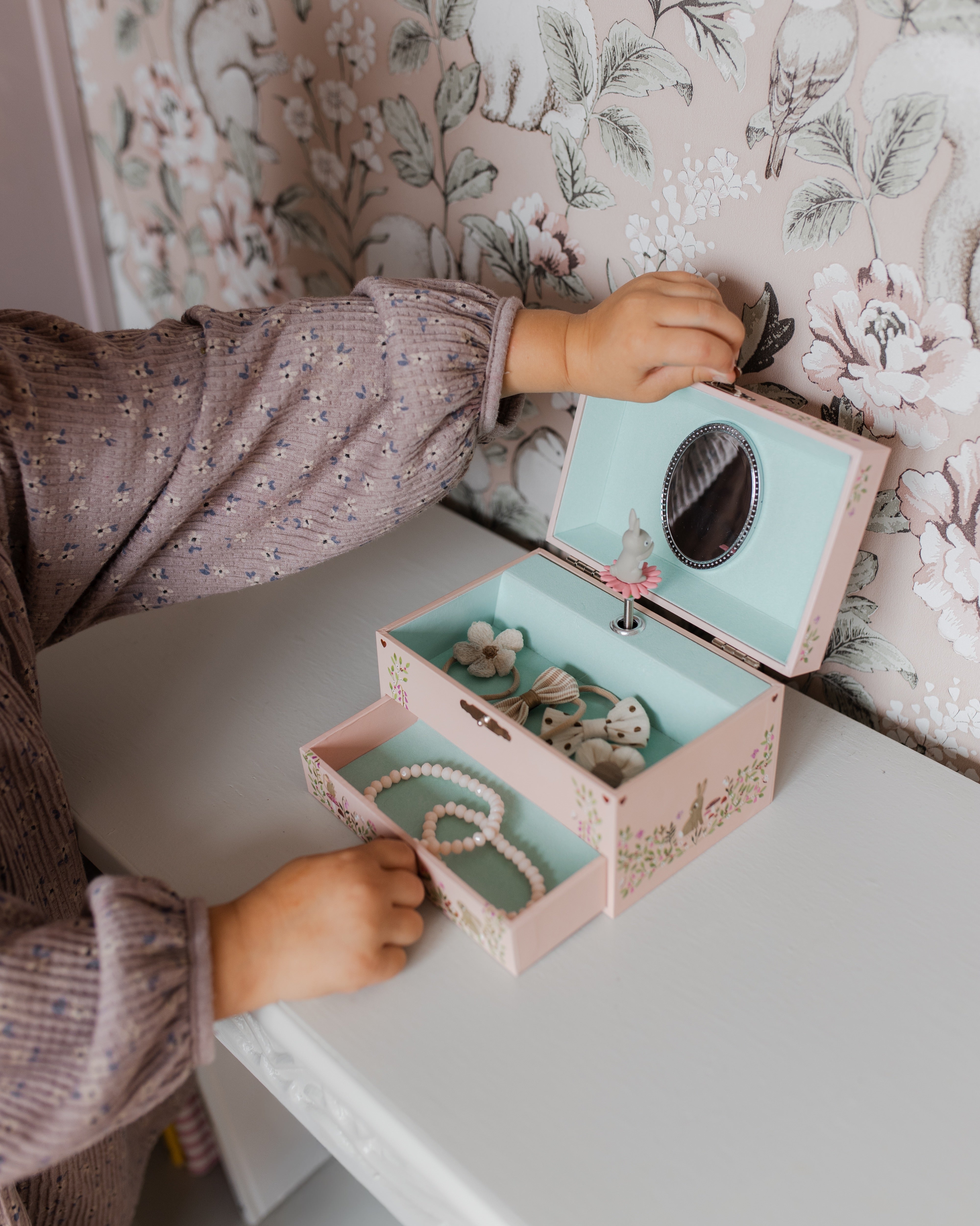 The musicbox has a small drawer to store all your rings, necklaces and hairclips.
