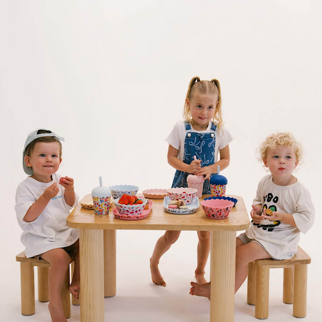 Add a little fruity fun to their mealtimes! Our brand new kids silicone dinnerware sets come as a set of three complete with with 1 x serving platter, 1 x plate and 1 x bowl.
