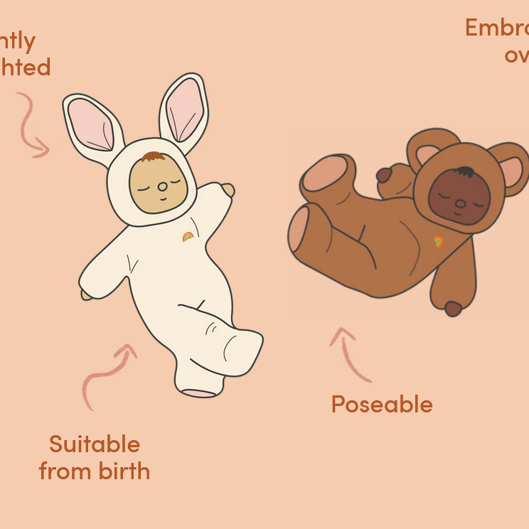 - Cozy Dinkum Dolls wear a non-removable plush onesie with ears and embroidered rainbow over the heart