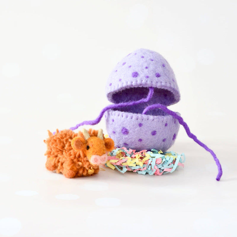 Untie the ribbon and uncover a delightful surprise inside this handcrafted purple felt egg, beautifully decorated with playful dots. Nestled within is a cute baby Highland cow, waiting to be discovered and cherished. With its sweet expression and tiny bell around its neck, this adorable little cow is ready to bring charm to your child’s imaginative play.