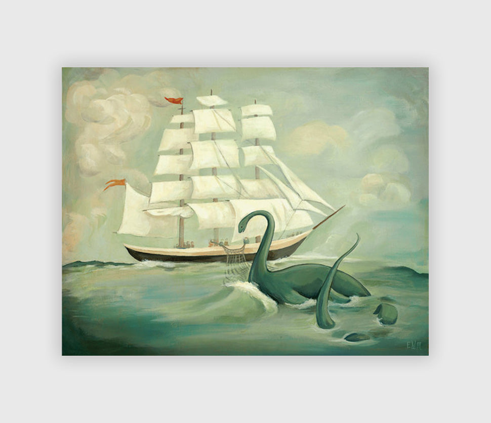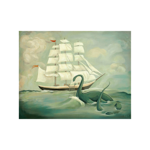 She says about this piece, “One of my favorite things in all the world are sea monsters, ancient & cryptozoological alike (lake monsters aren't too shabby, either.) This scene depicts a brave ship's attempt to snare one, and it didn't go terribly well.”