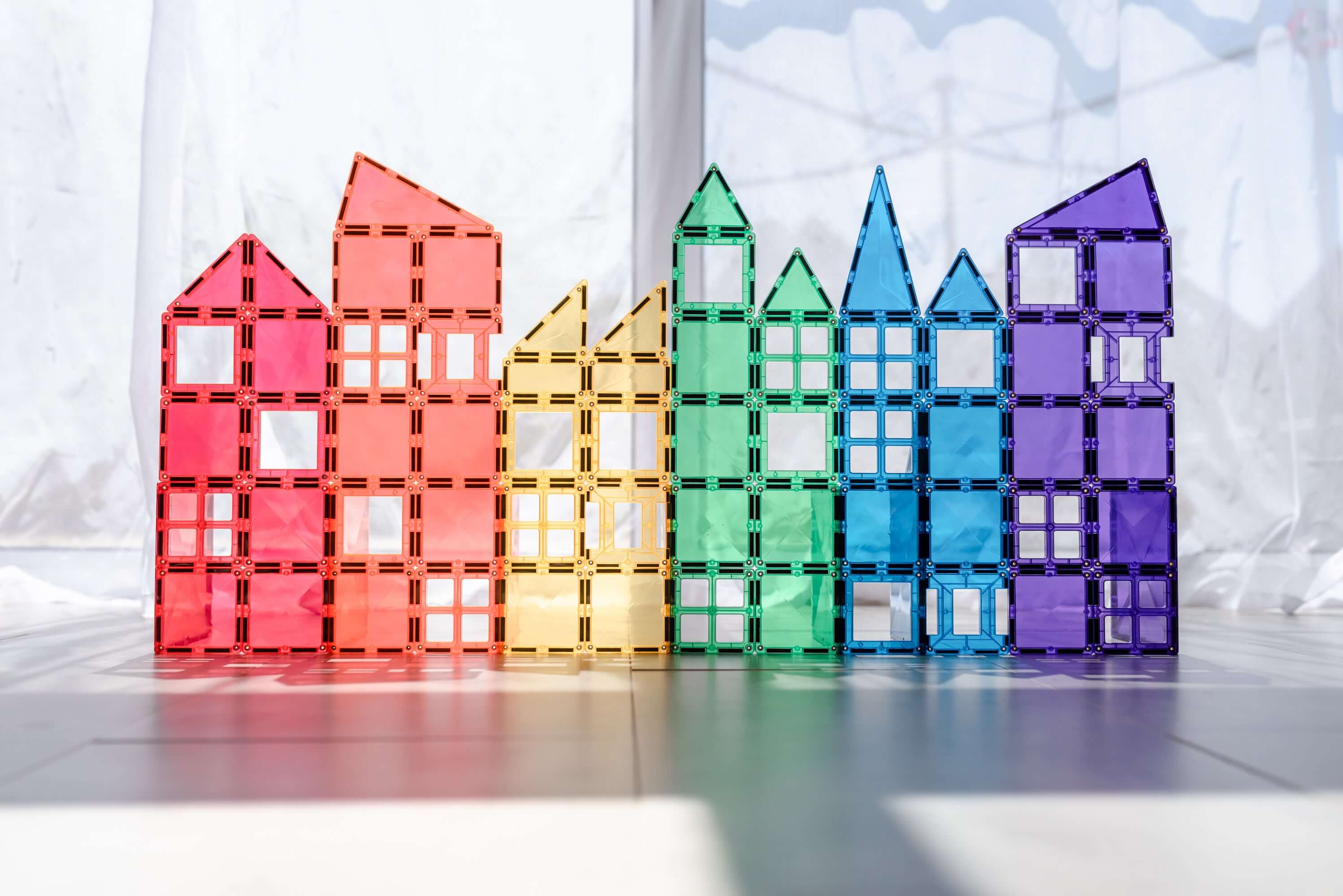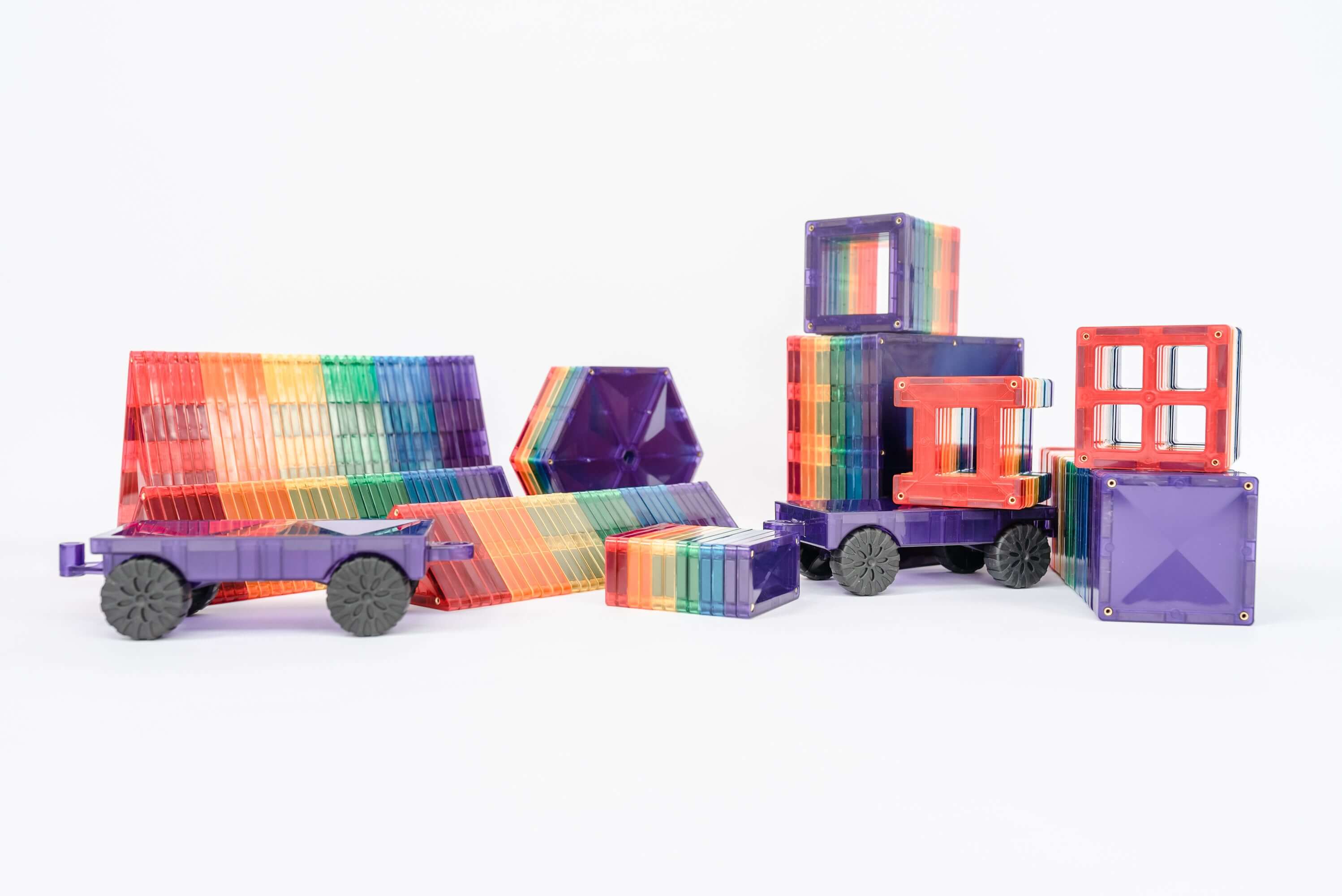 Watch ideas and designs come to life as children build rainbow coloured creations such as the classic Connetix rainbow, incredibly tall walls and towers, castles and houses, theme parks, robots, creatures, farm trucks and firetrucks, trains and train tracks – the possibilities really are limited only by your imagination with this pack!