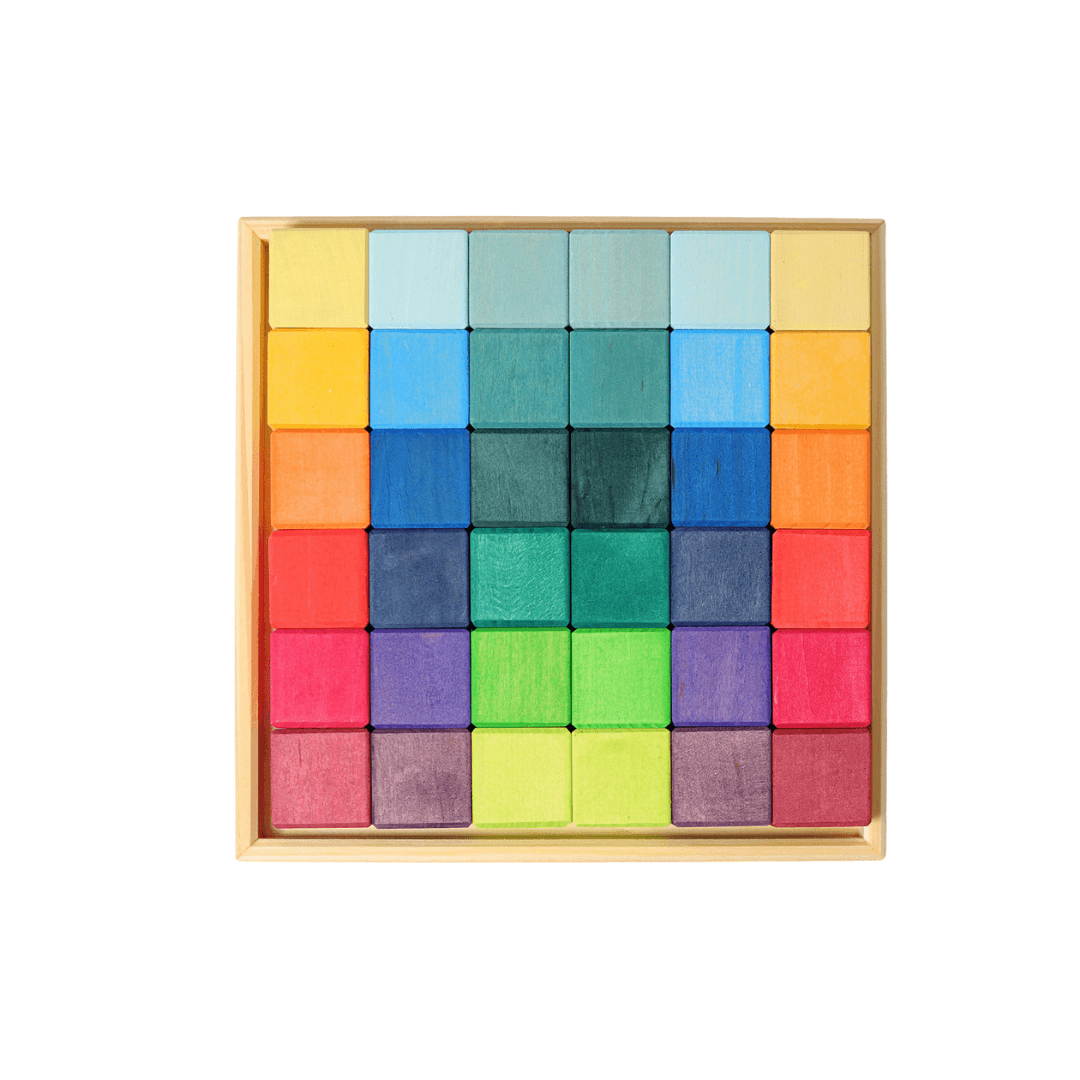 36 building blocks in a wooden frame.
