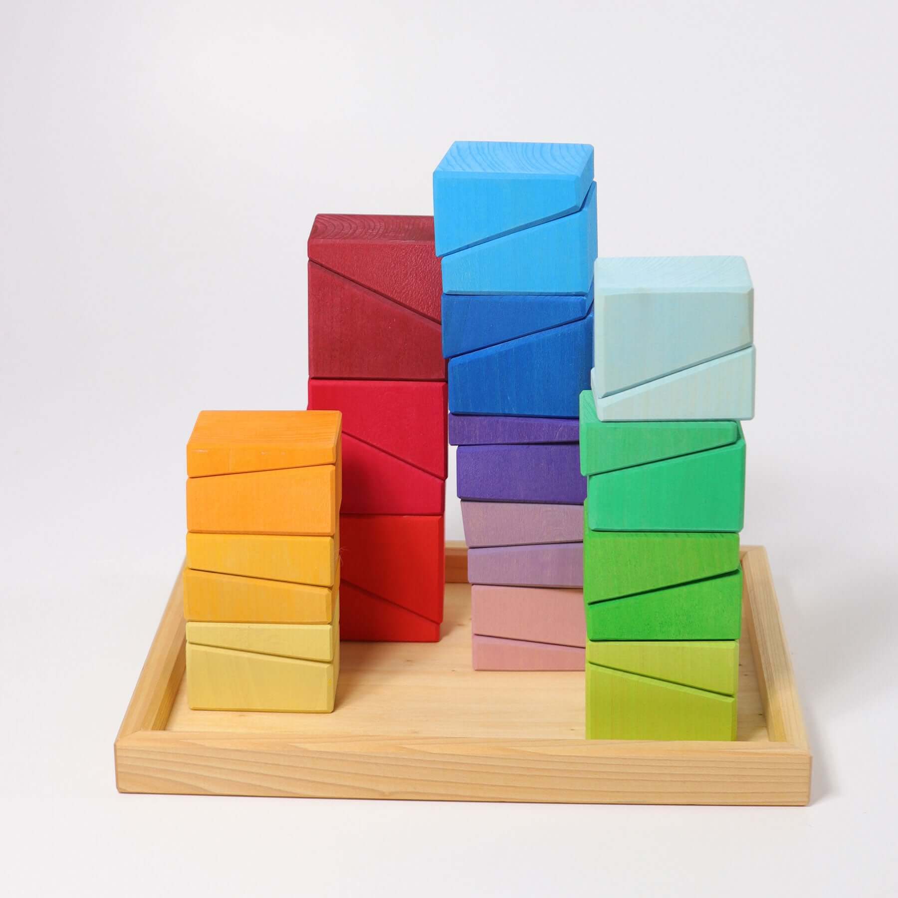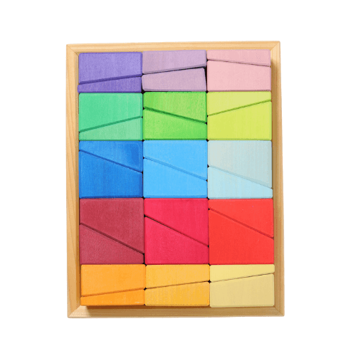 Tricky building set with different tilted blocks. Only the matching colours will complete a rectangle. All 6 blocks within one shade of colour (blue/red/green/yellow and purple) have the same tilt angle and therefore will also complete a rectangle.