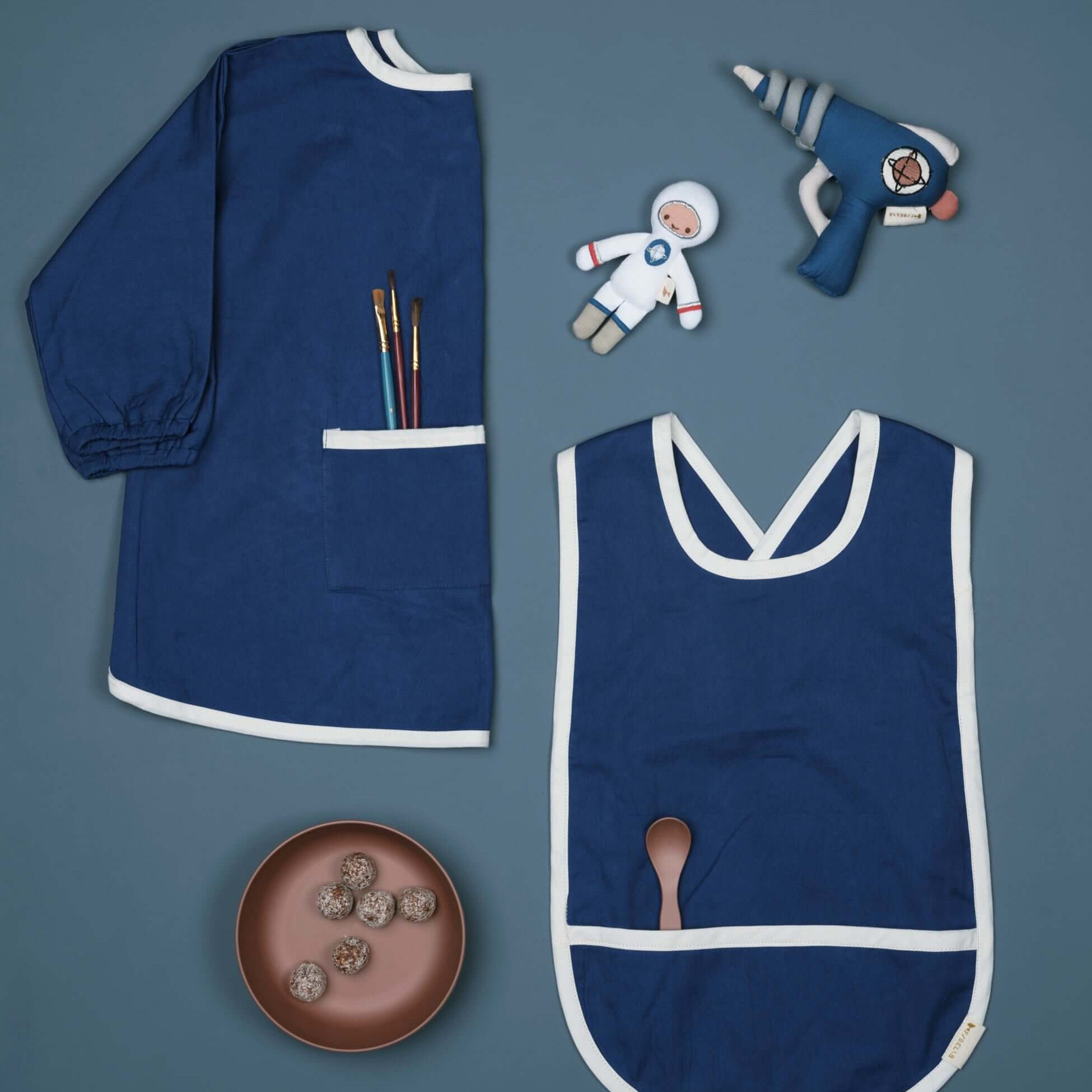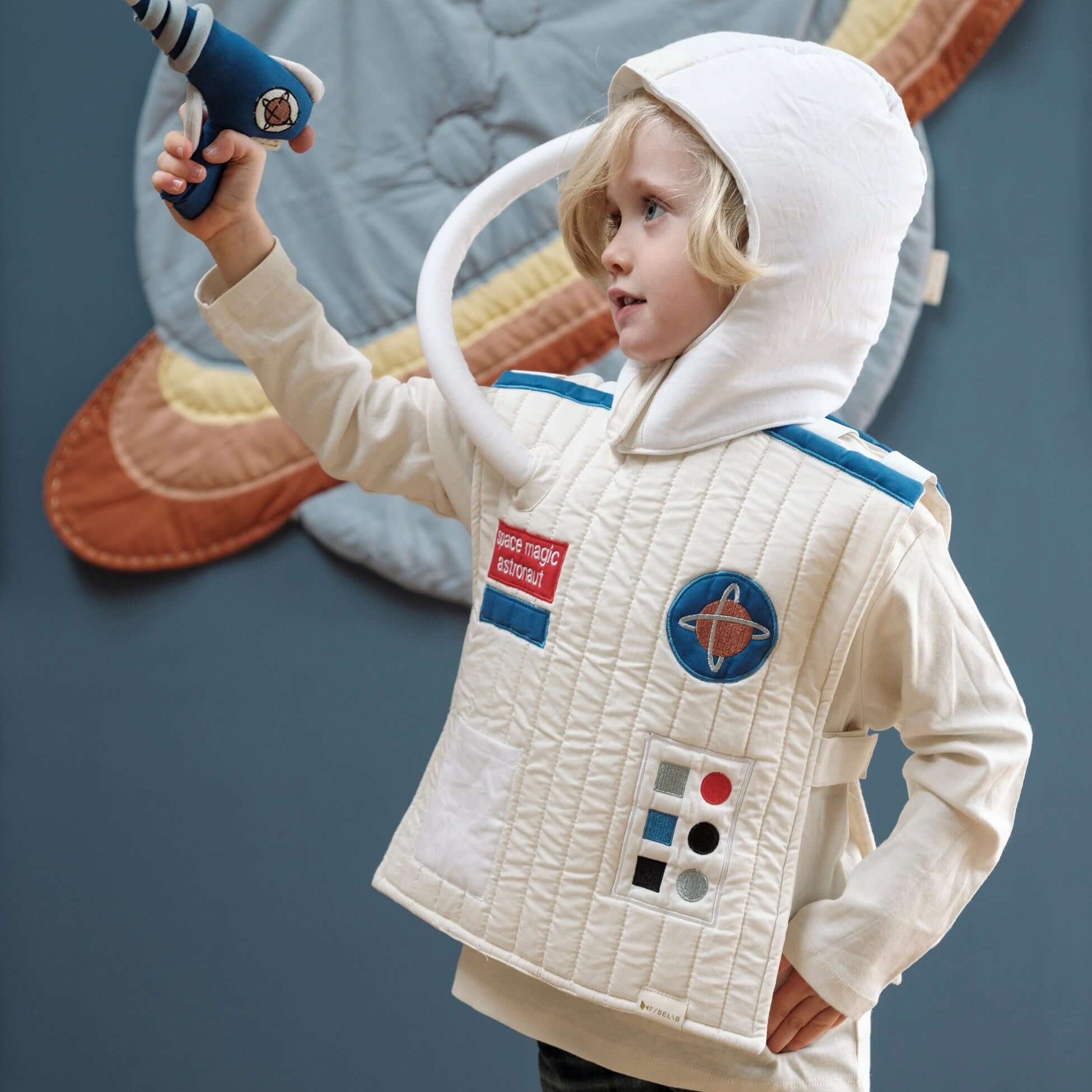 The dress-up set consists of a quilted vest with beautifully embroidered details, a quilted and a soft space helmet.