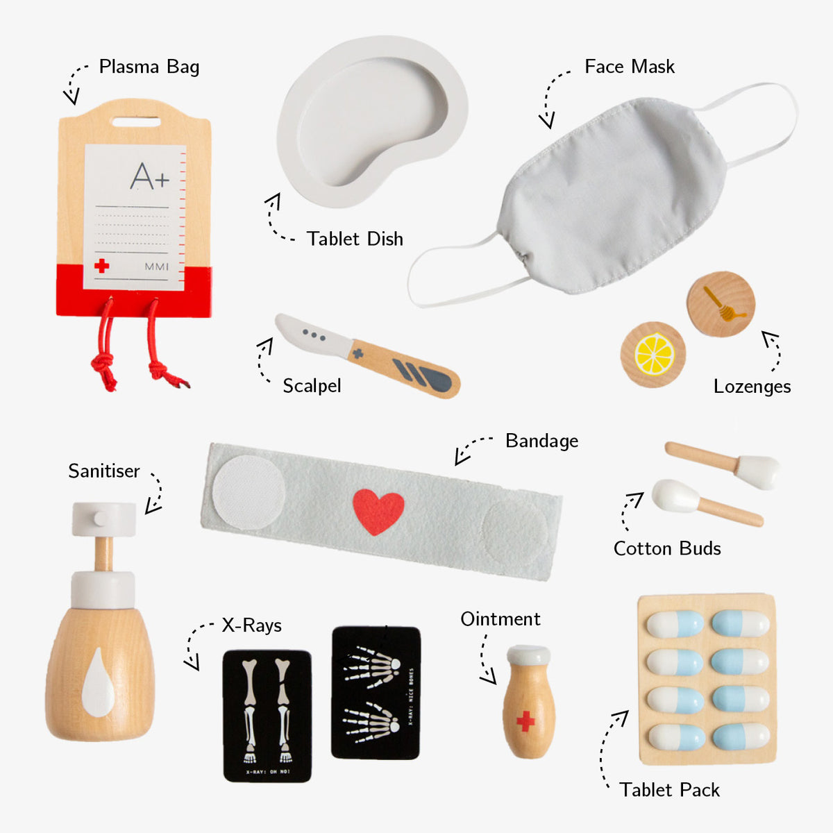 Kit includes: 1 x fabric Face Mask, 1 x fabric Bandage, 1 x Tablet Pack, 1 x Plasma Bag, 1x Sanitizer Pump, 1 x Scalpel, 1 x Ointment Bottle, 2 x Cotton Buds, 2 x X-Rays, 2 x Lozenges , 1 x Tablet Dish
