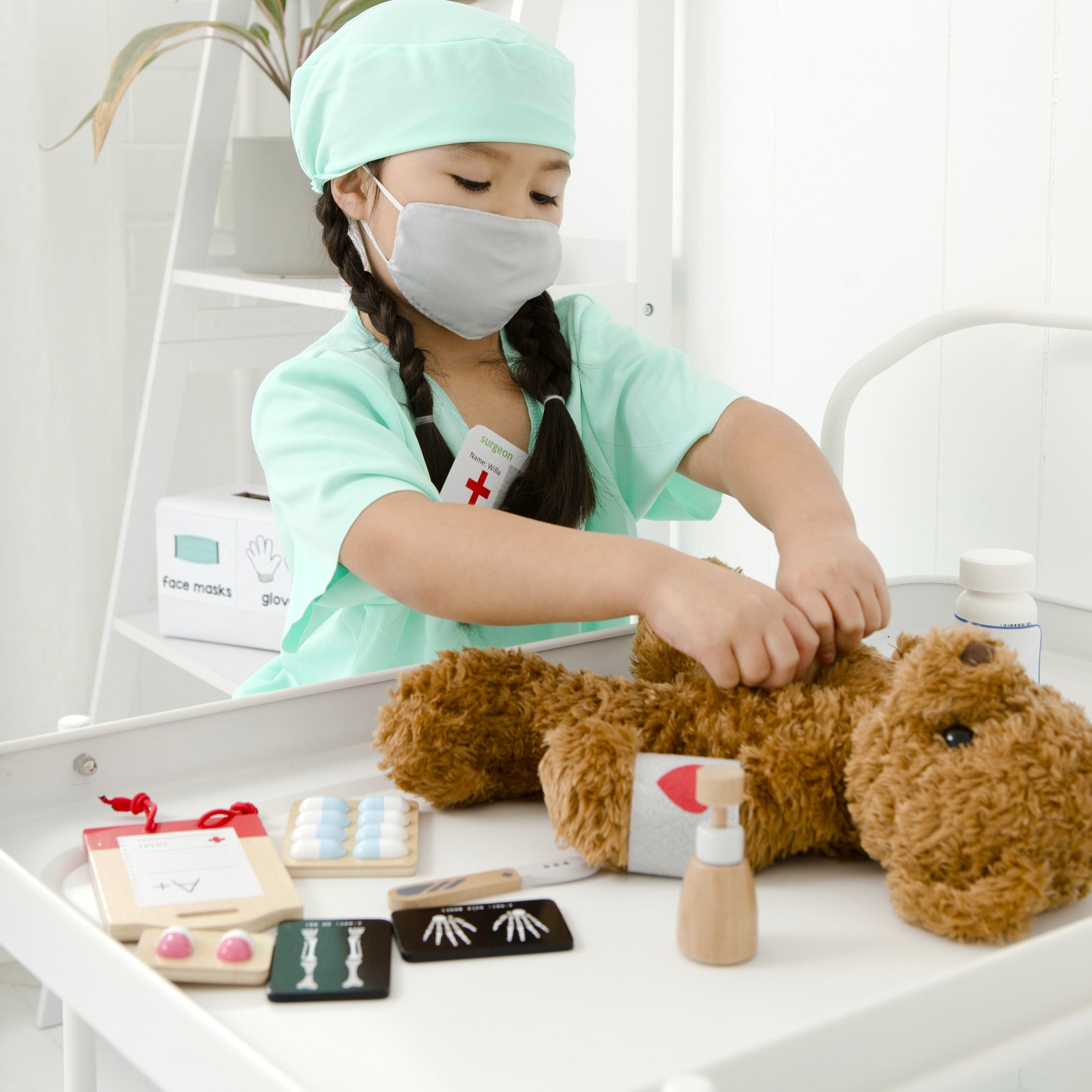 Create your own hospital at home and call in the whole team, stat! Poor Ted looks like he has a broken leg and he needs help quick! With play surgical equipment, mini x-rays, and everything you need for administering first aid or making your patient comfortable, this beautiful wooden surgeons kit will allow you to specialize and create even more roles to try out. The ideal addition to our iconic doctors kit, now you can open up a whole new world of play with your friends.