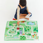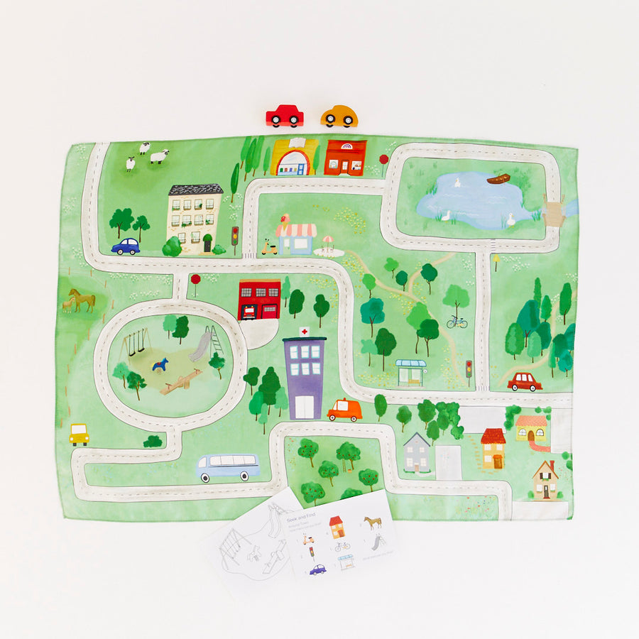 Our new Around the Town map (21” x 29”) is perfect for small world play combined with the two little wooden cars that fit perfectly on the roads. Little ones love to play seek & find too, can you find the toy store? Ice cream shop? Playground? Sheep? Bus stop? Vespa?