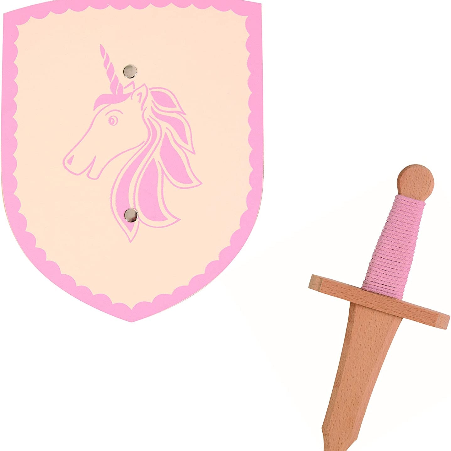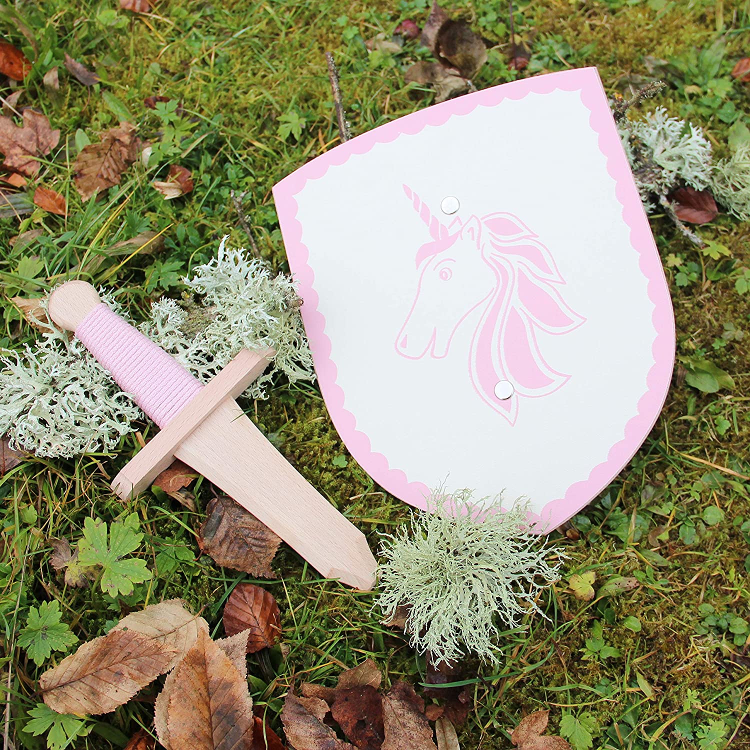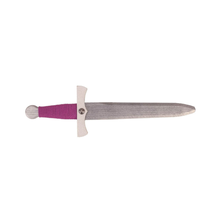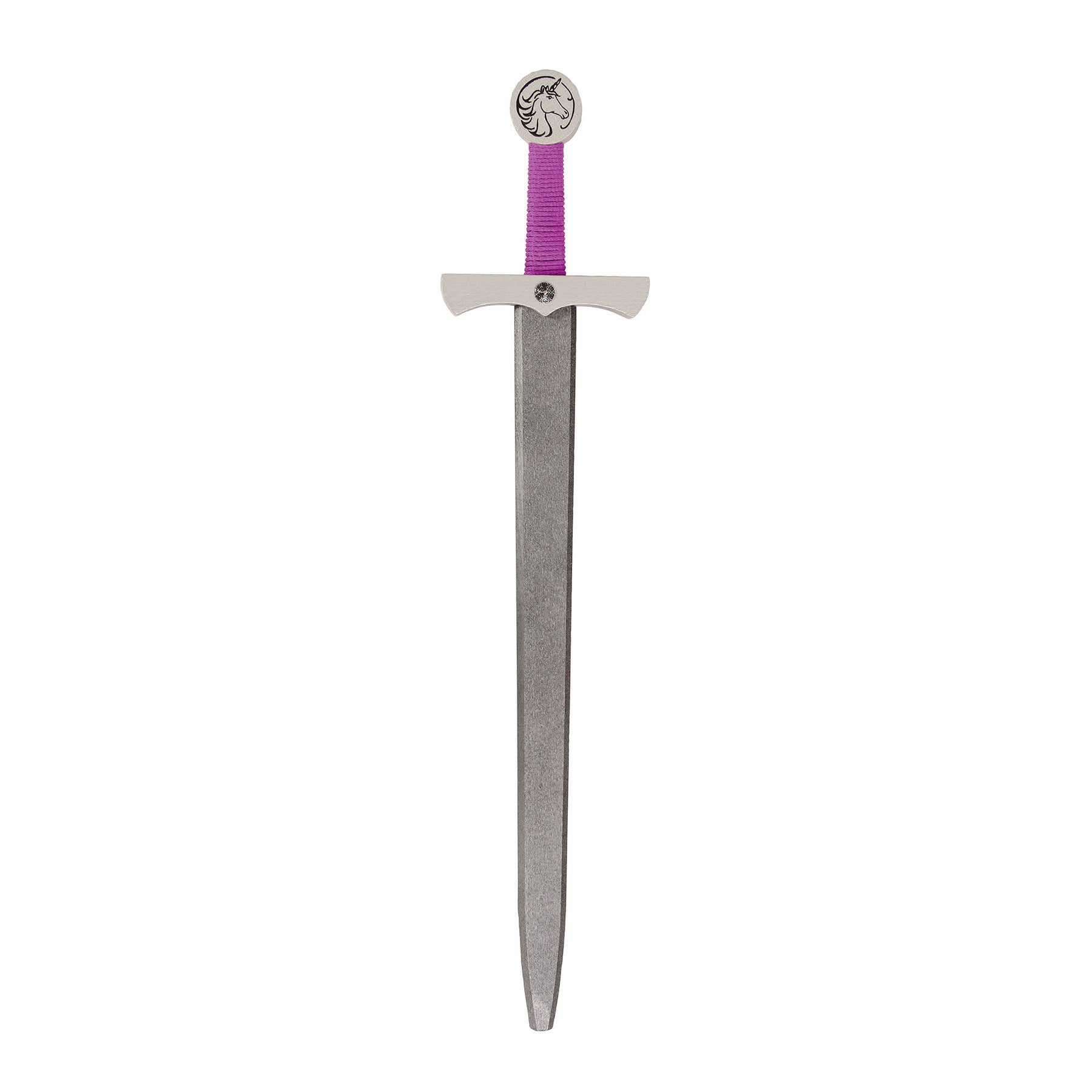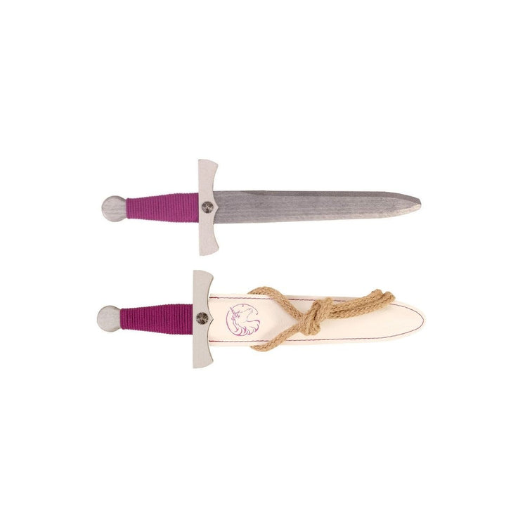 Arabella dagger from the toy manufacturer VAH! The dagger Arabella is made of wood and colored antique silver. The handle is wrapped in pink braided cotton and feels particularly good in the hand. For protection and better portability, there is also a white synthetic leather sheath with a matching pink unicorn emblem. The Arabella dagger set has a length of 35 cm.