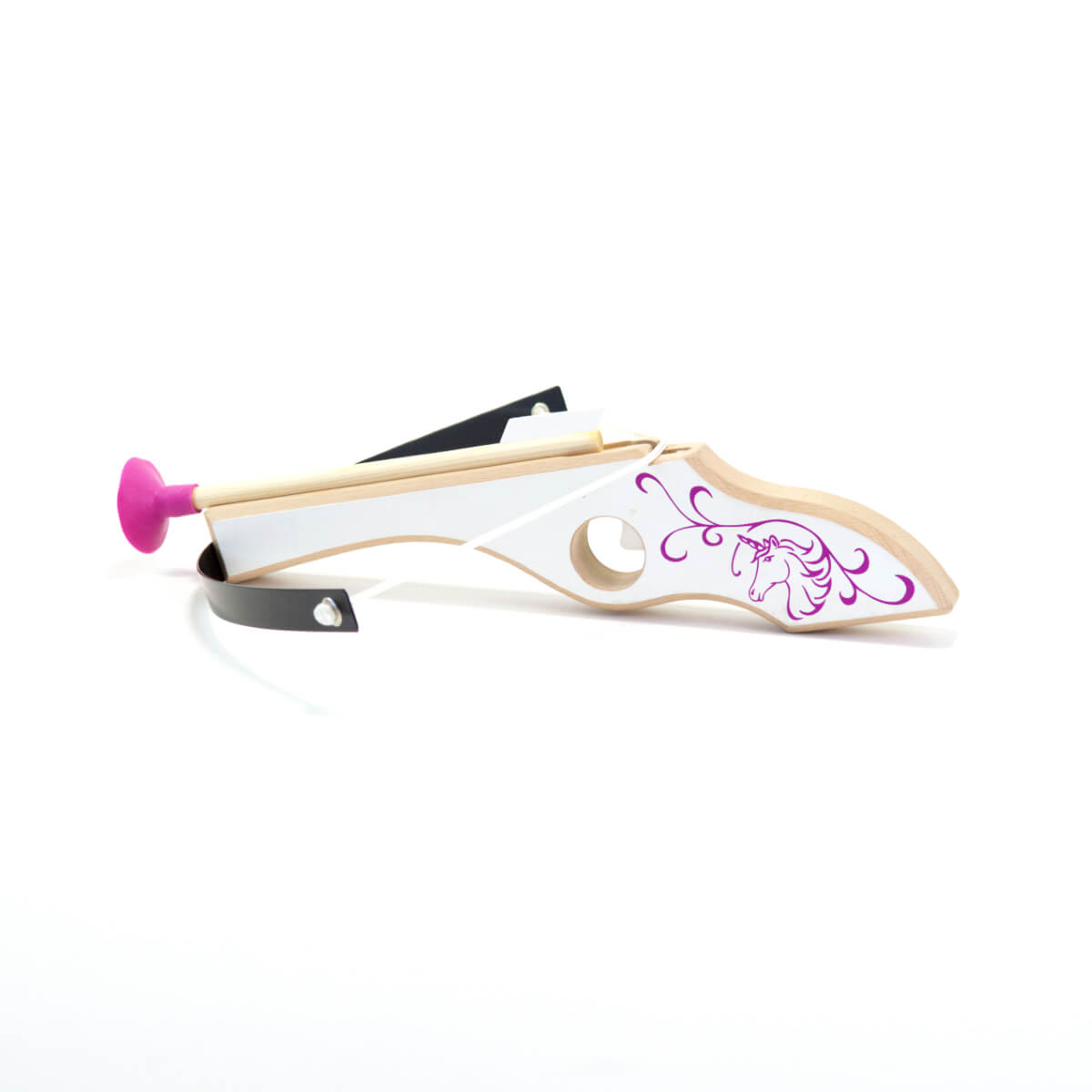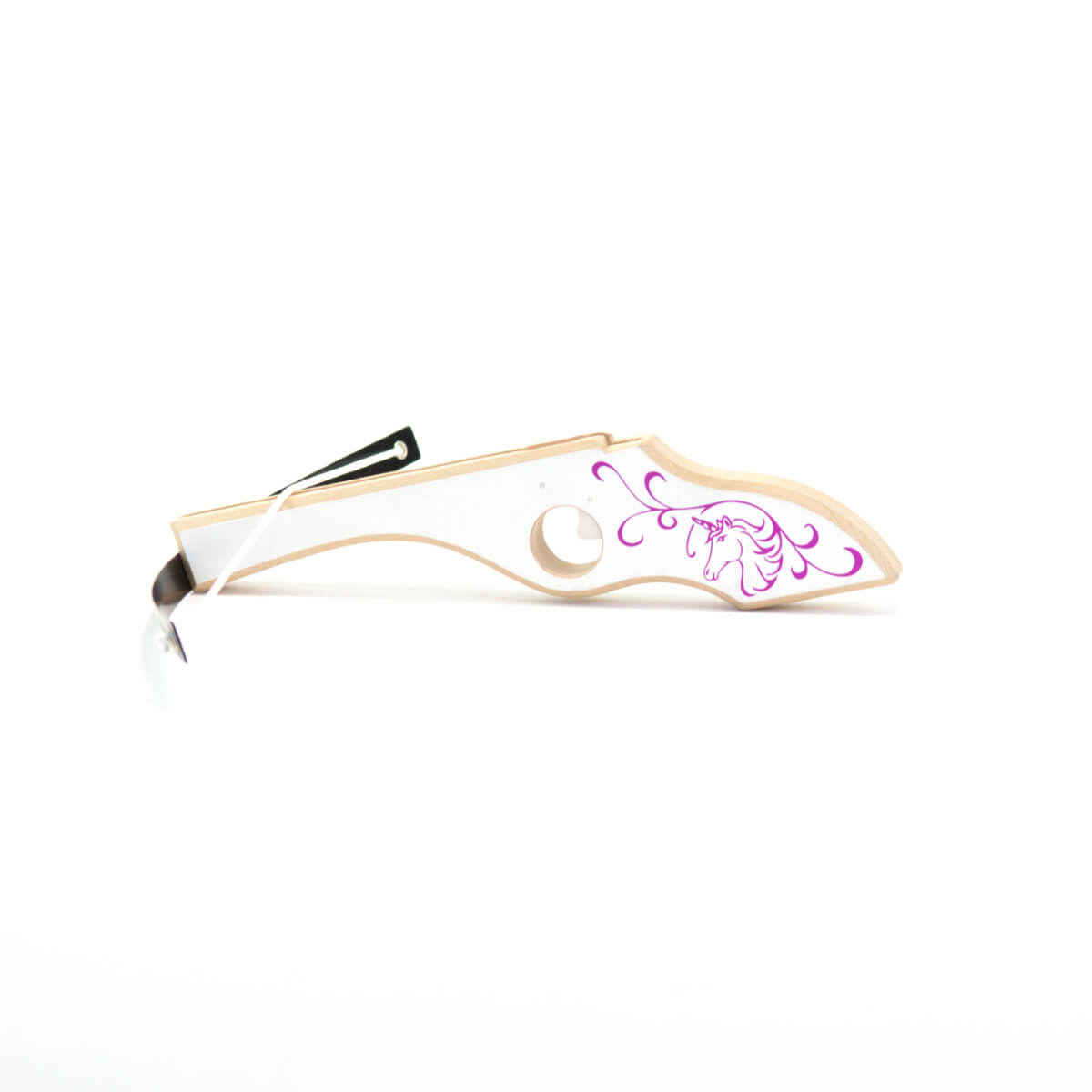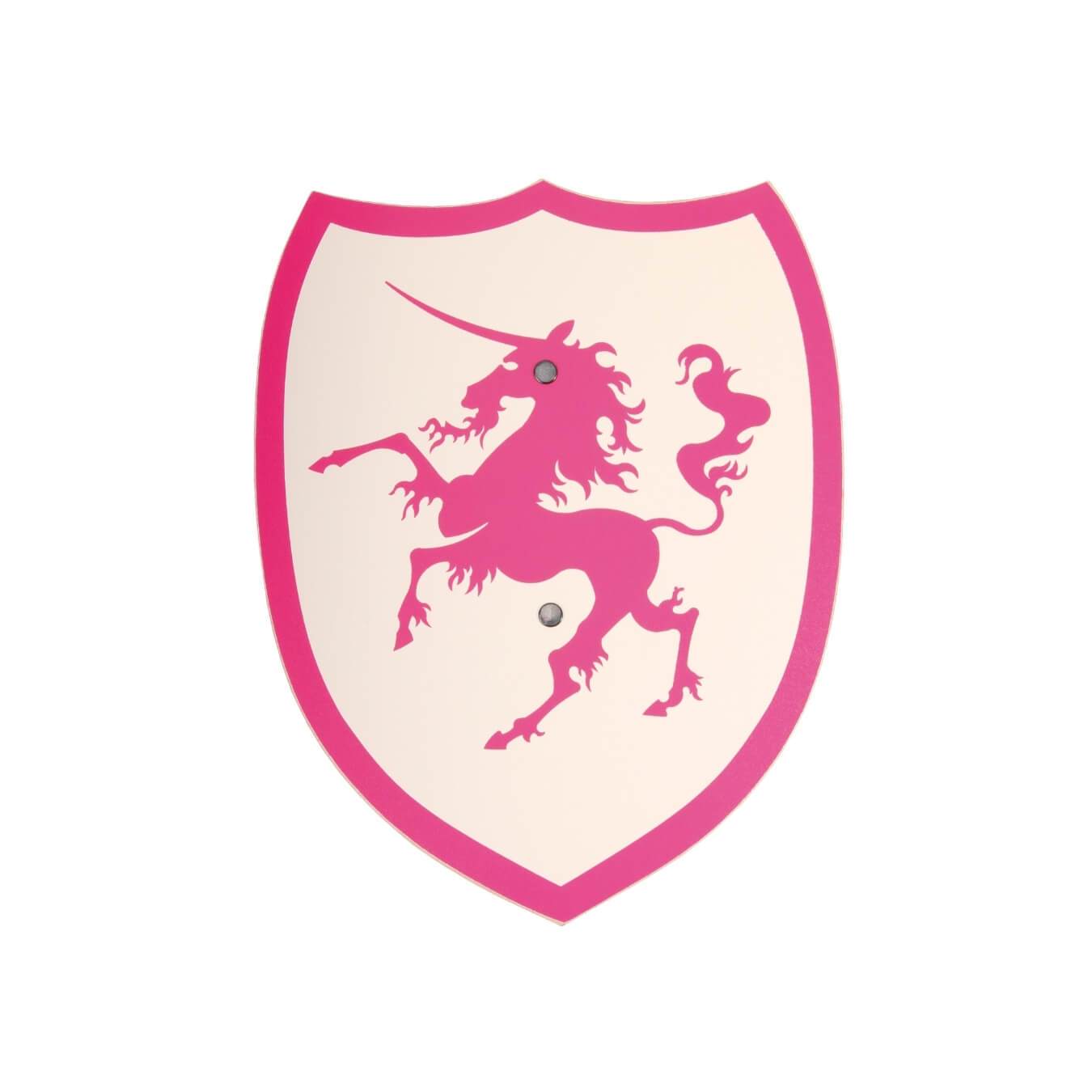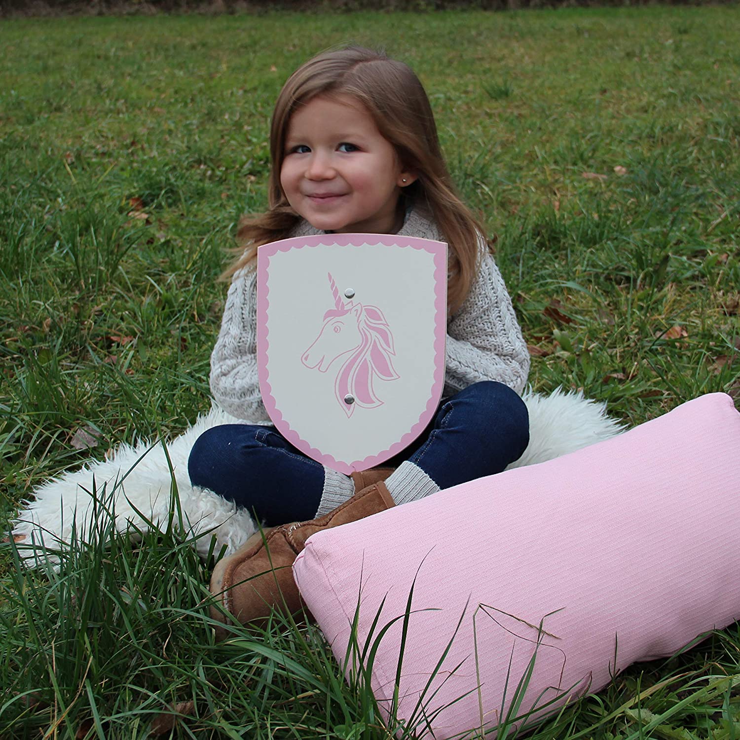 Arabella dagger from the toy manufacturer VAH! The dagger Arabella is made of wood and colored antique silver. The handle is wrapped in pink braided cotton and feels particularly good in the hand. For protection and better portability, there is also a white synthetic leather sheath with a matching pink unicorn emblem. The Arabella dagger set has a length of 35 cm.