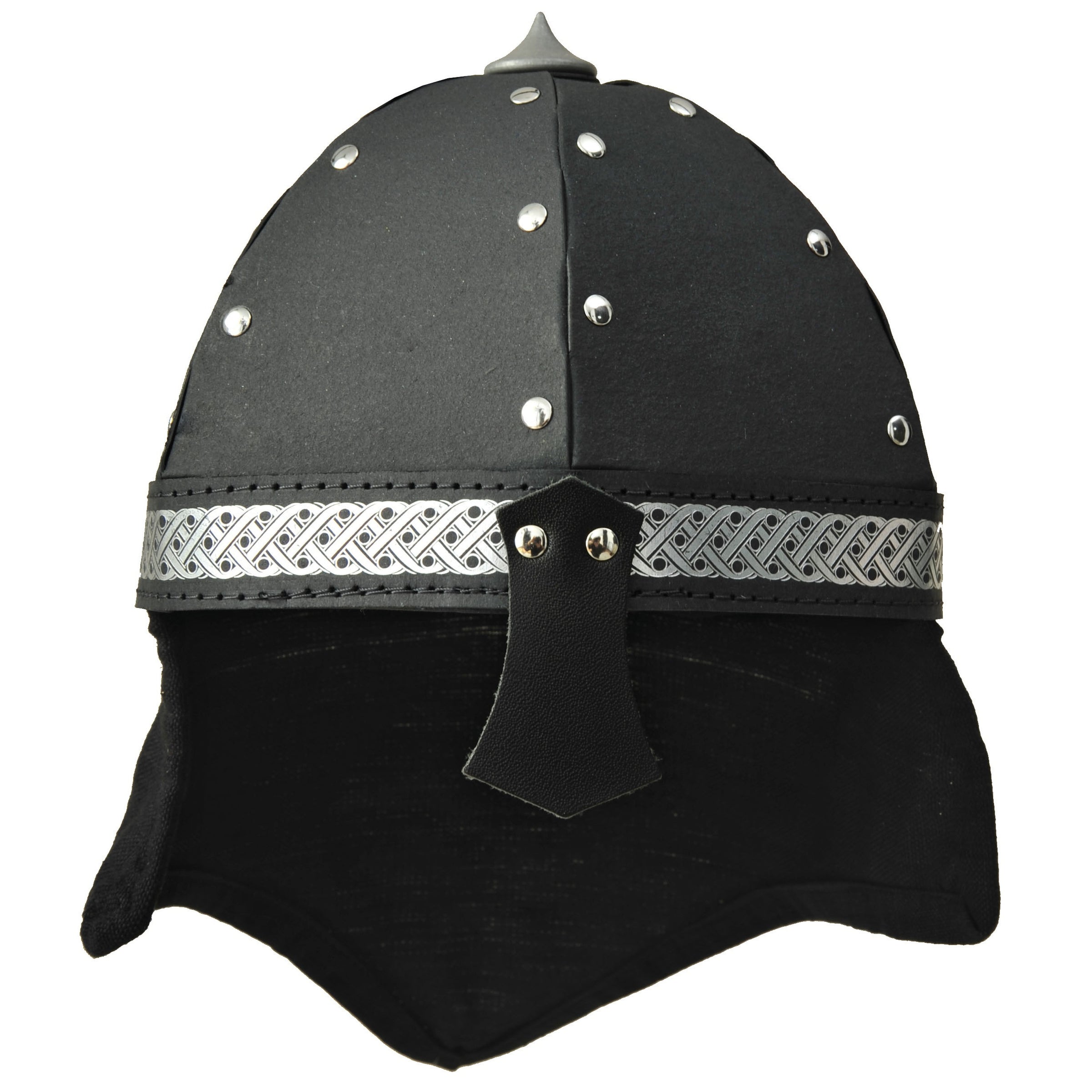 The Vah Black Alamann Knight Helmet is an archer's half helmet with cotton neck protection made from robust black cardboard with metal rivets holding it together, a pointed rivet helmet tip, cotton lining and neck protection, a decorative silver headband, and leather nose protection. Perfect for pretend play and dressing up, this toy Knights Helmet looks the part teamed up with a sword and shield from the Vah range.