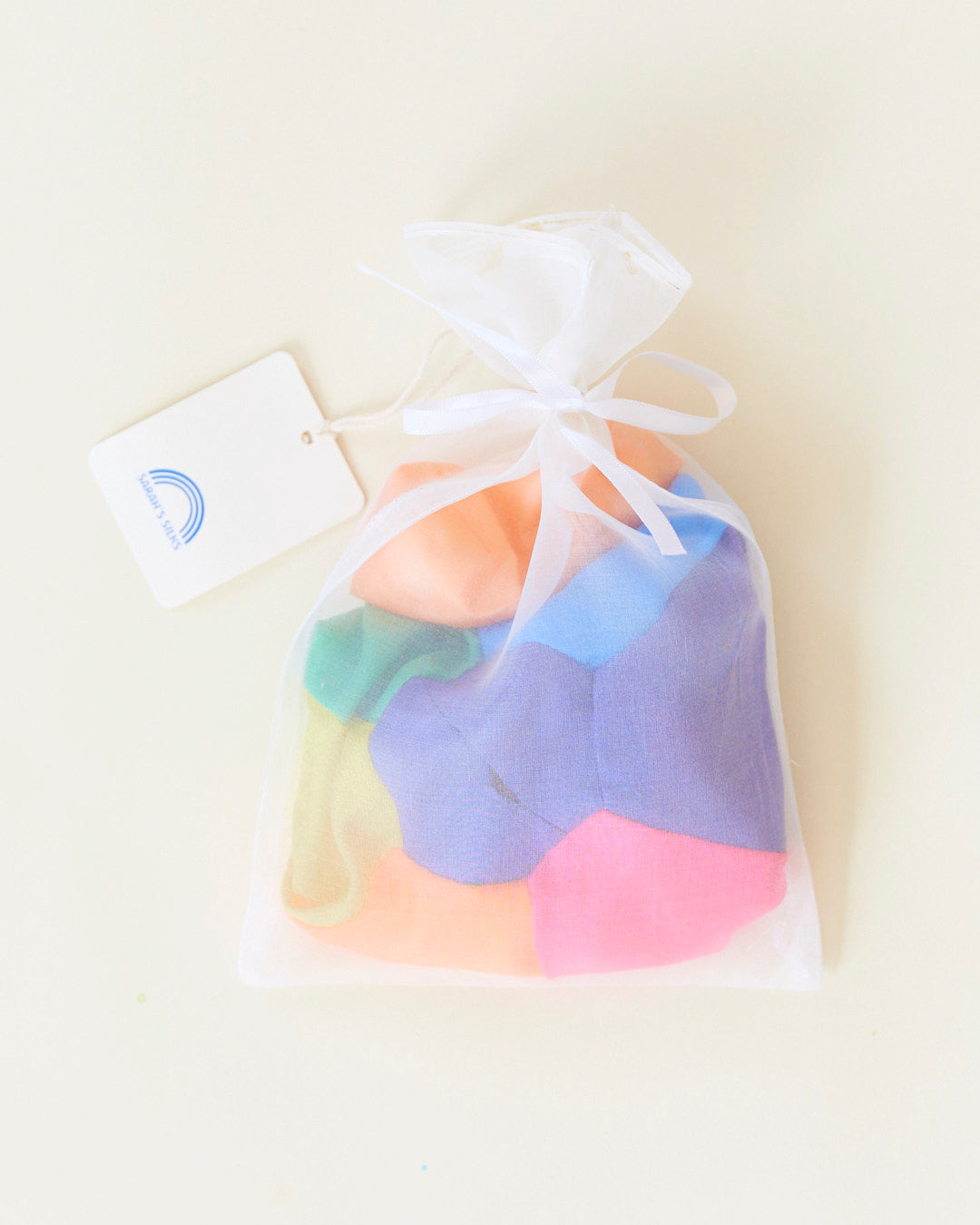 The Rainbow Balloon Ball comes packaged in a lightweight silk bag, with clear safety warnings on the hang tag.