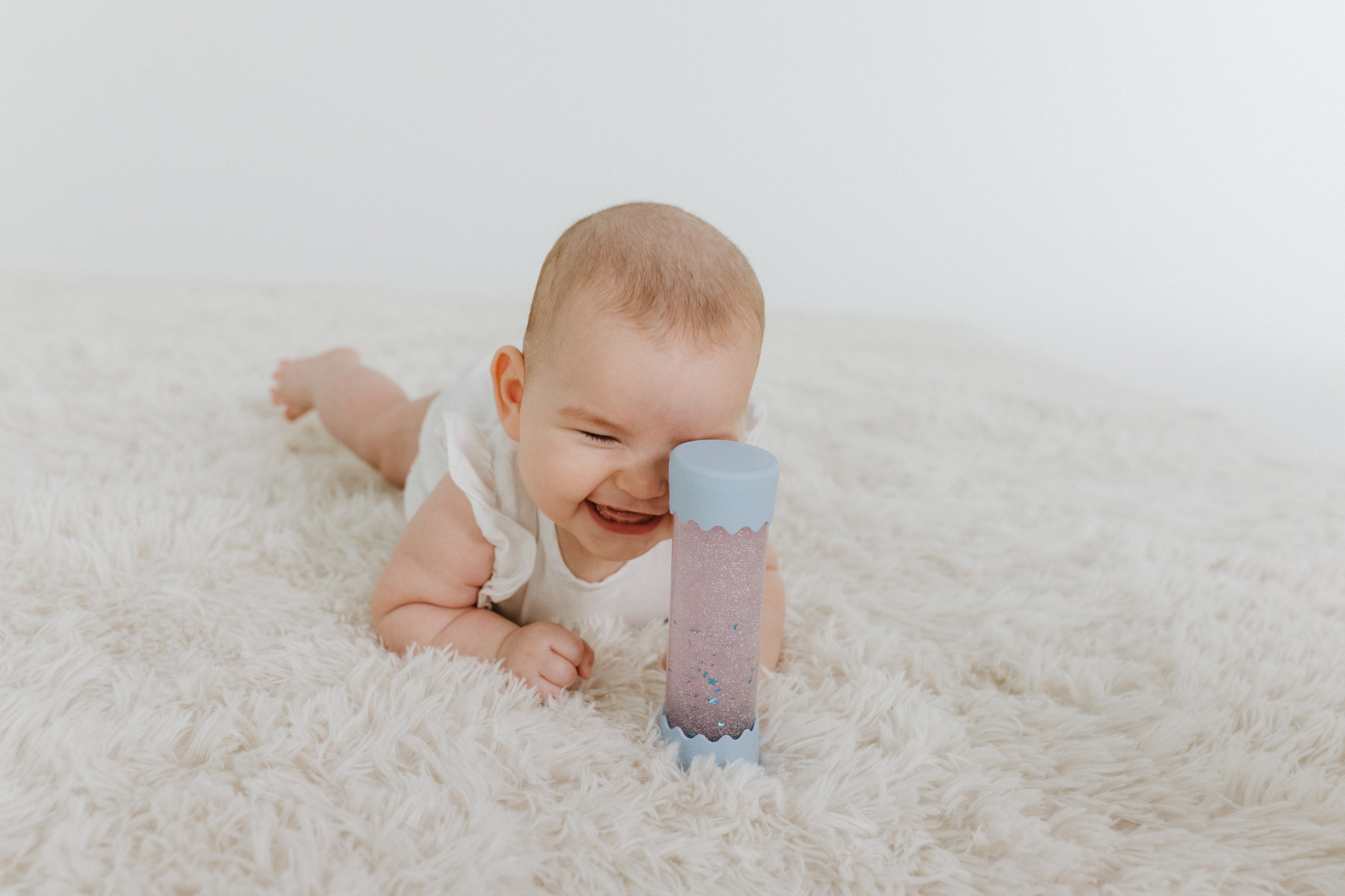 Babies are captivated by the swirling sparkles and glitter. The transparent design allows your little explorer to watch a symphony of colors, shapes, and textures swirling within, providing endless fascination and visual stimulation. It’s the perfect tummy time activity as they babies roll it back and forth on playmats.