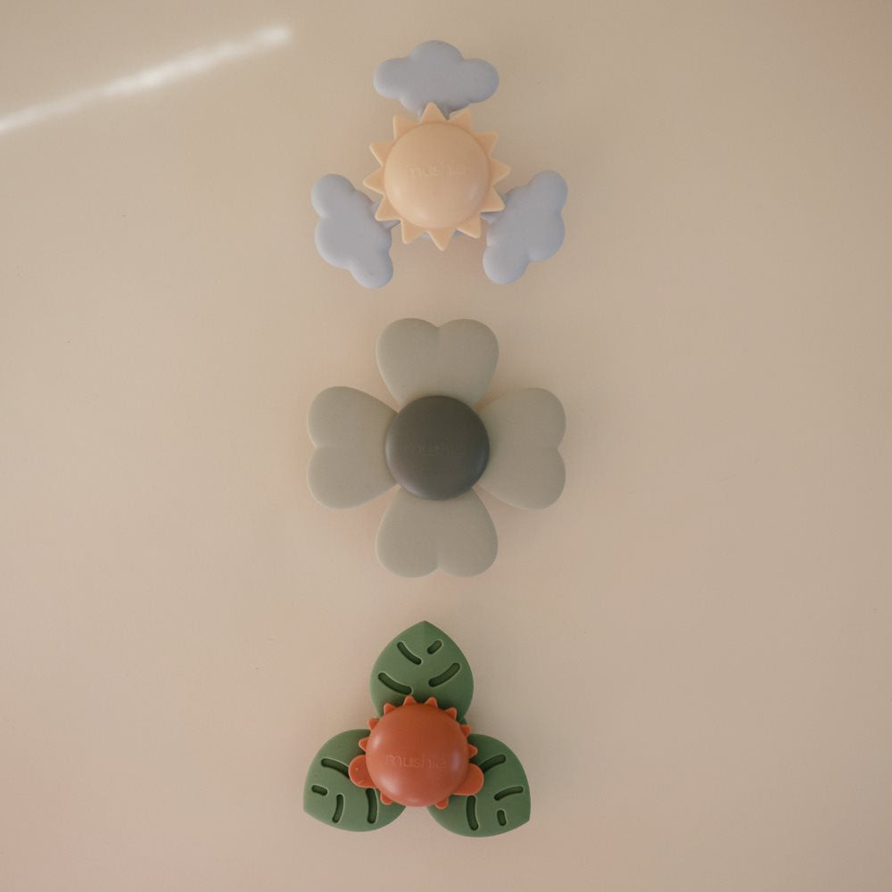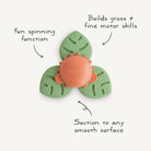 The toy is made from plastic and food-grade silicone and is designed to create sensory experiences for children. It also has a suction feature that ensures the spinner toy stays in place – this prevents accidental drops and encourages independent play. Try the suction feature on doors, chairs, in the bathtub etc.