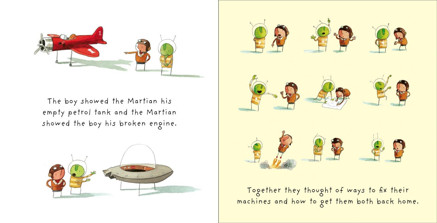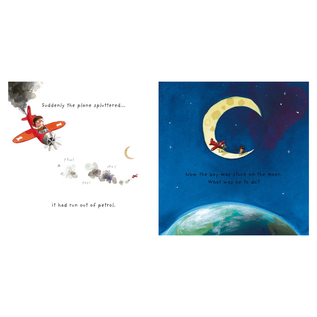He didn’t remember leaving it in there, but he thought he’d take it out for a go right away. At first, all went well and the plane flew higher and higher and higher until… suddenly, with a splutter, it ran out of petrol. The boy was stuck on the moon… and he was not alone…