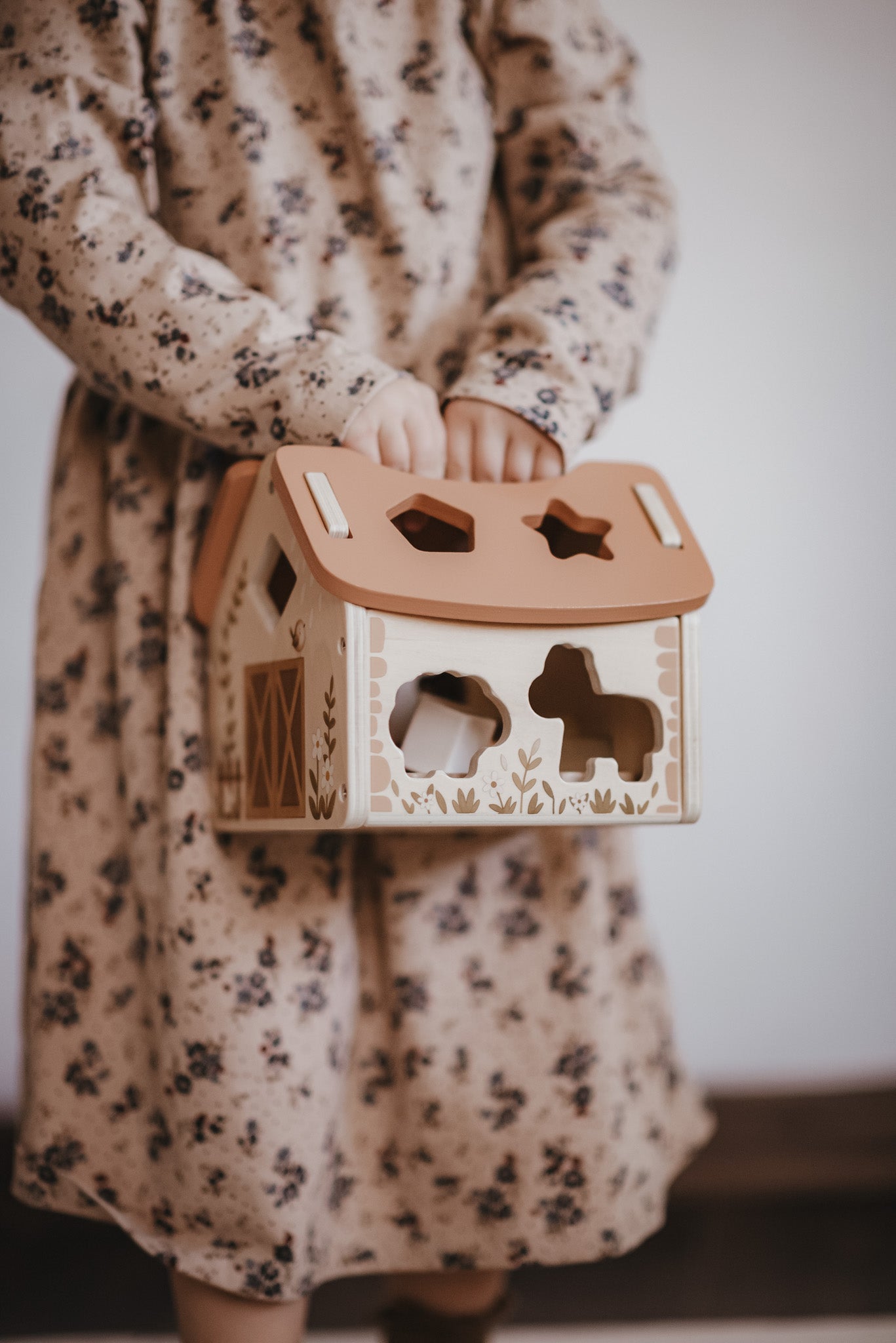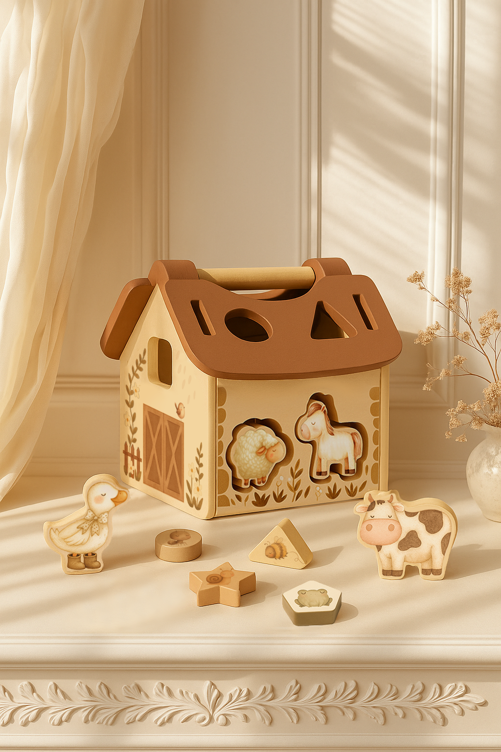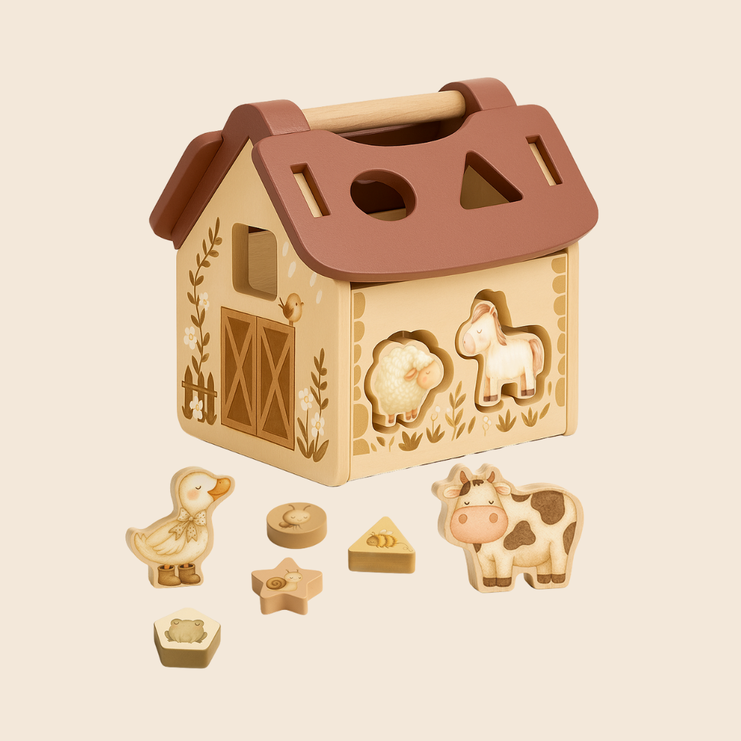 Discover the magical world of the farm with this adorable wooden shape sorter! The barn comes with farm-themed animal and object pieces that children can fit into the corresponding holes, encouraging motor skills, visual perception, and logical thinking.