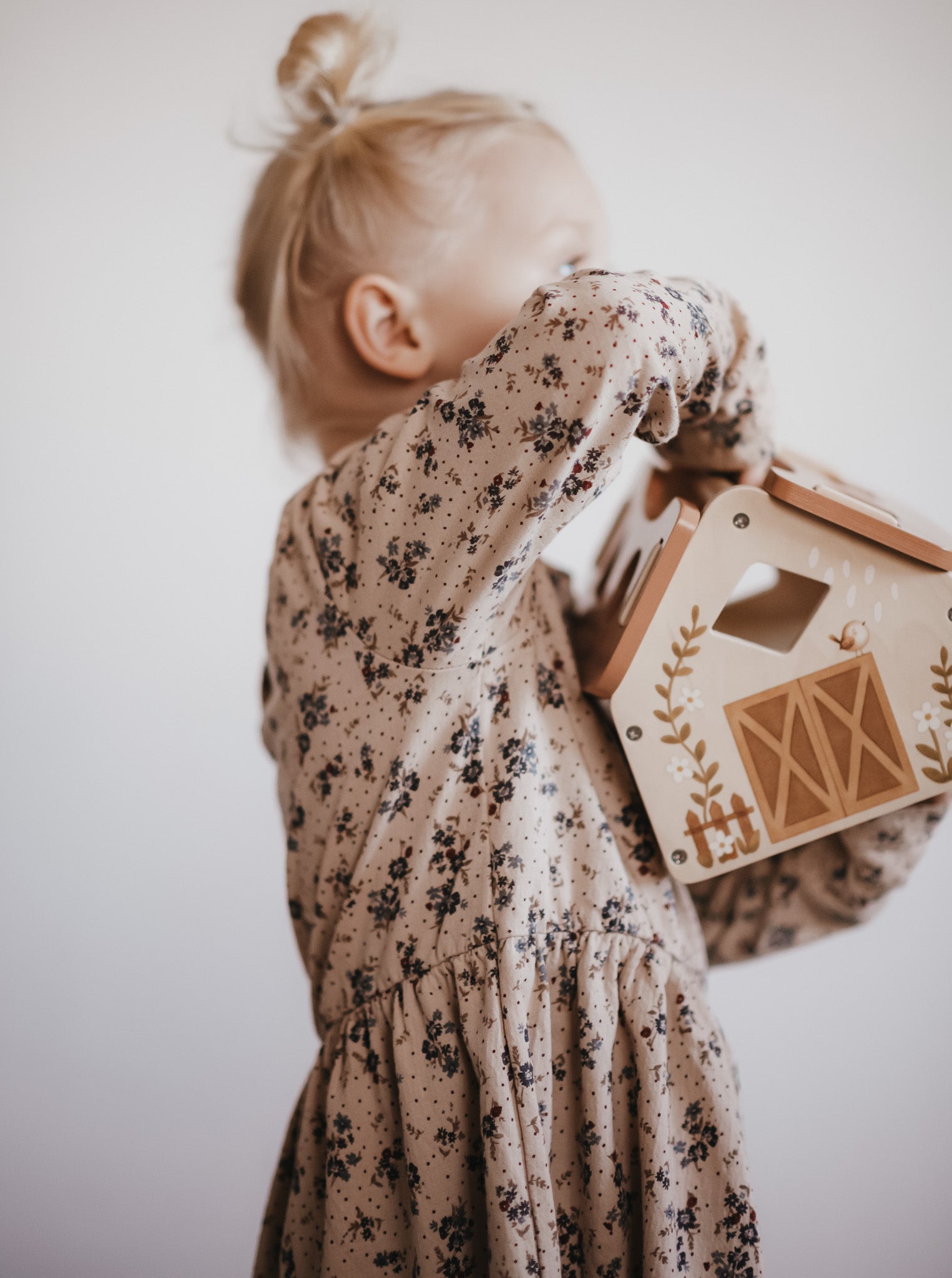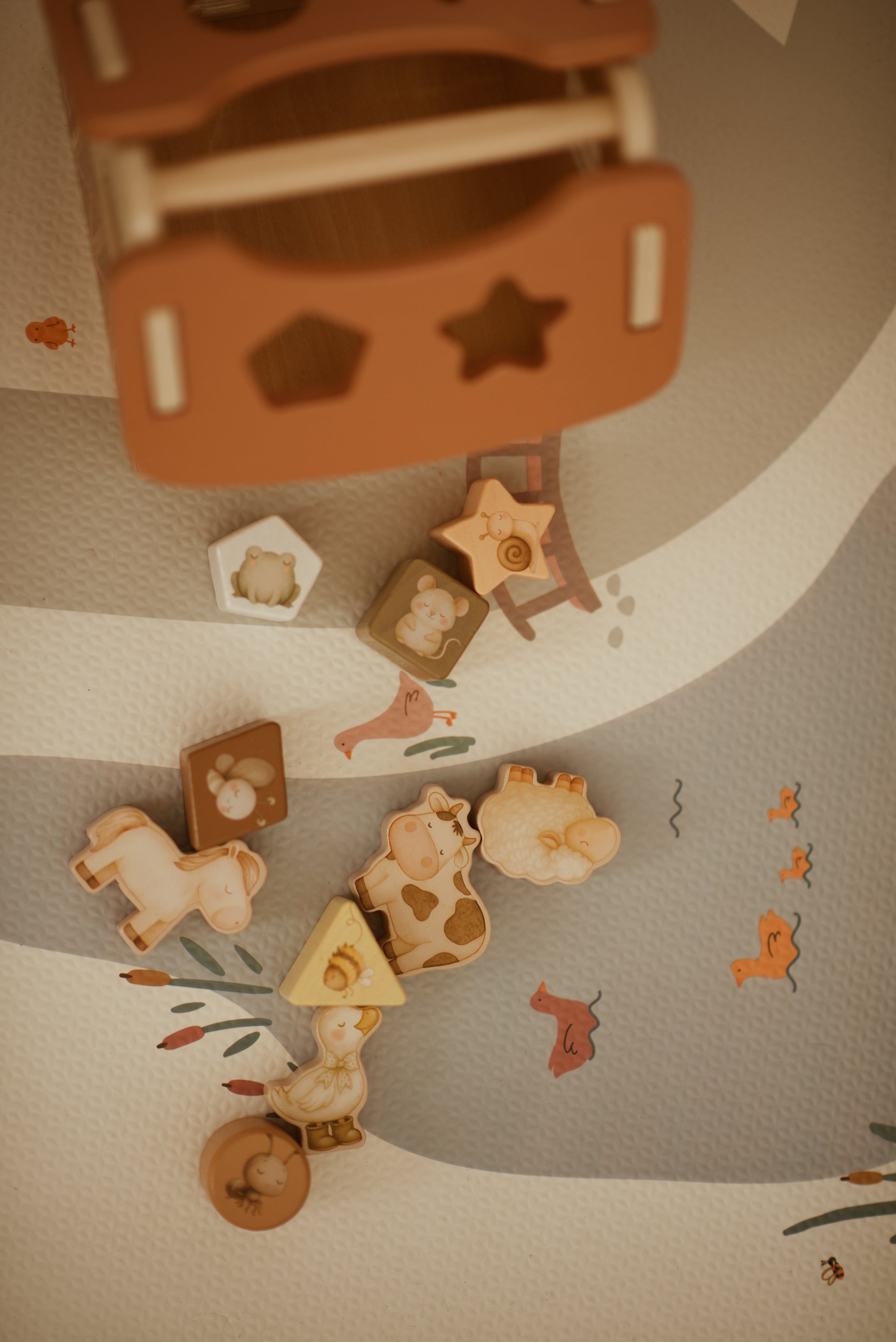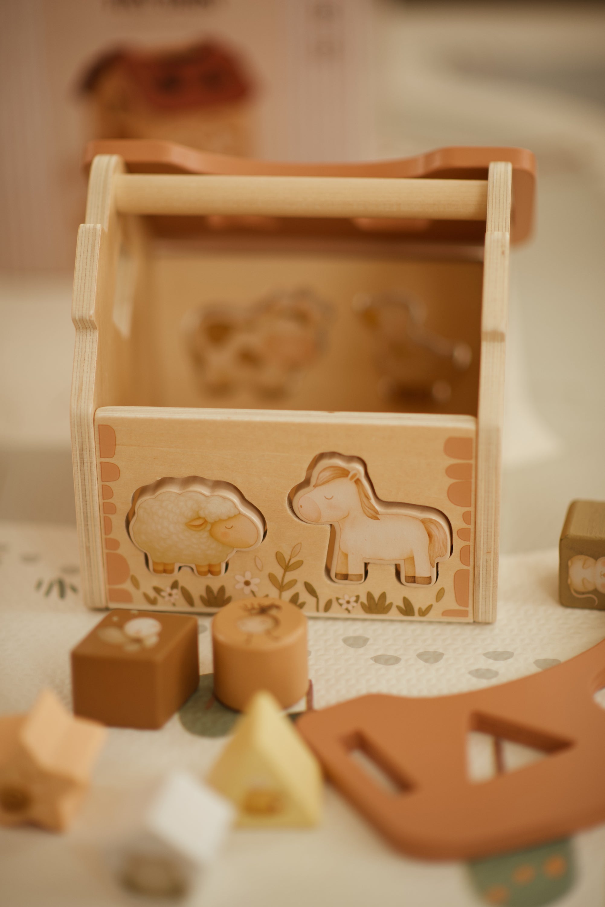 Discover the magical world of the farm with this adorable wooden shape sorter! The barn comes with farm-themed animal and object pieces that children can fit into the corresponding holes, encouraging motor skills, visual perception, and logical thinking.