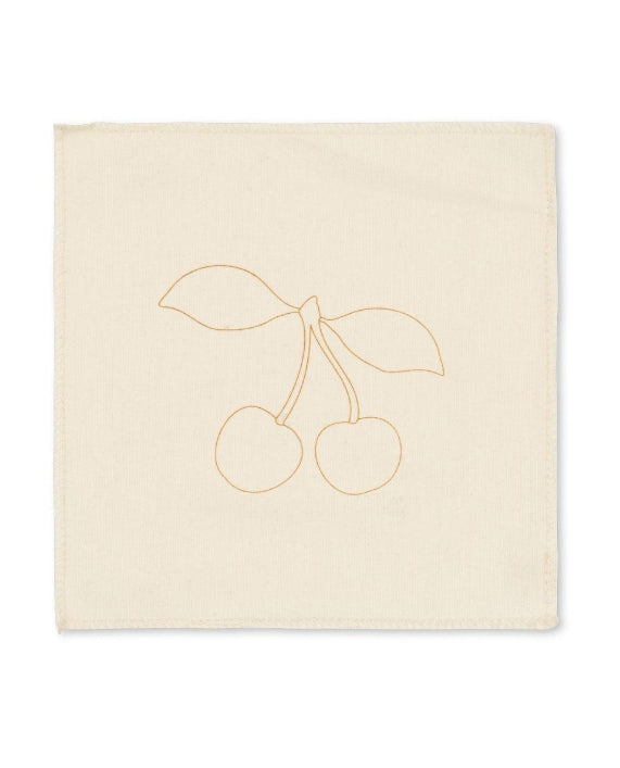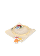 The kit includes: - a wooden loom - 6 pcs of small cotton threads in different colors - 4 pcs of fabric: 2 with prints and 2 without - 1 small metal needle.