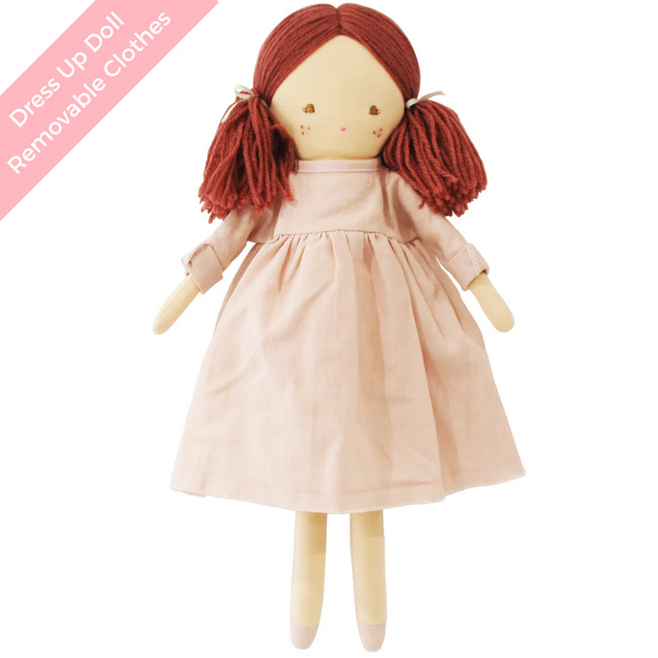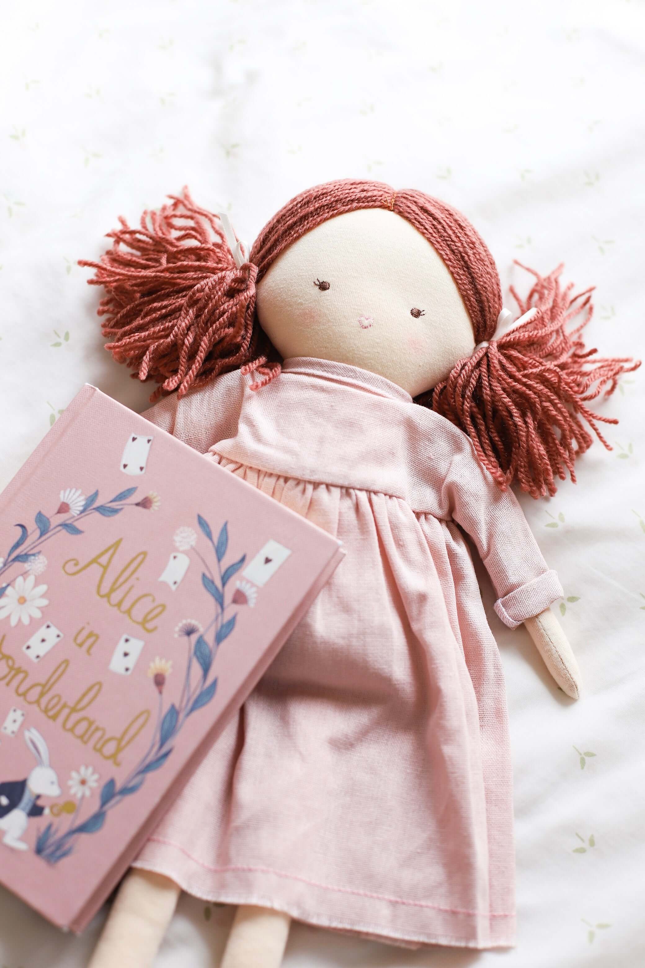Matilda is an adorable 45cm doll with gorgeous red yarn hair and an on trend pink linen frock. So comfy! Ready for a tea party. Suitable from 3 years.