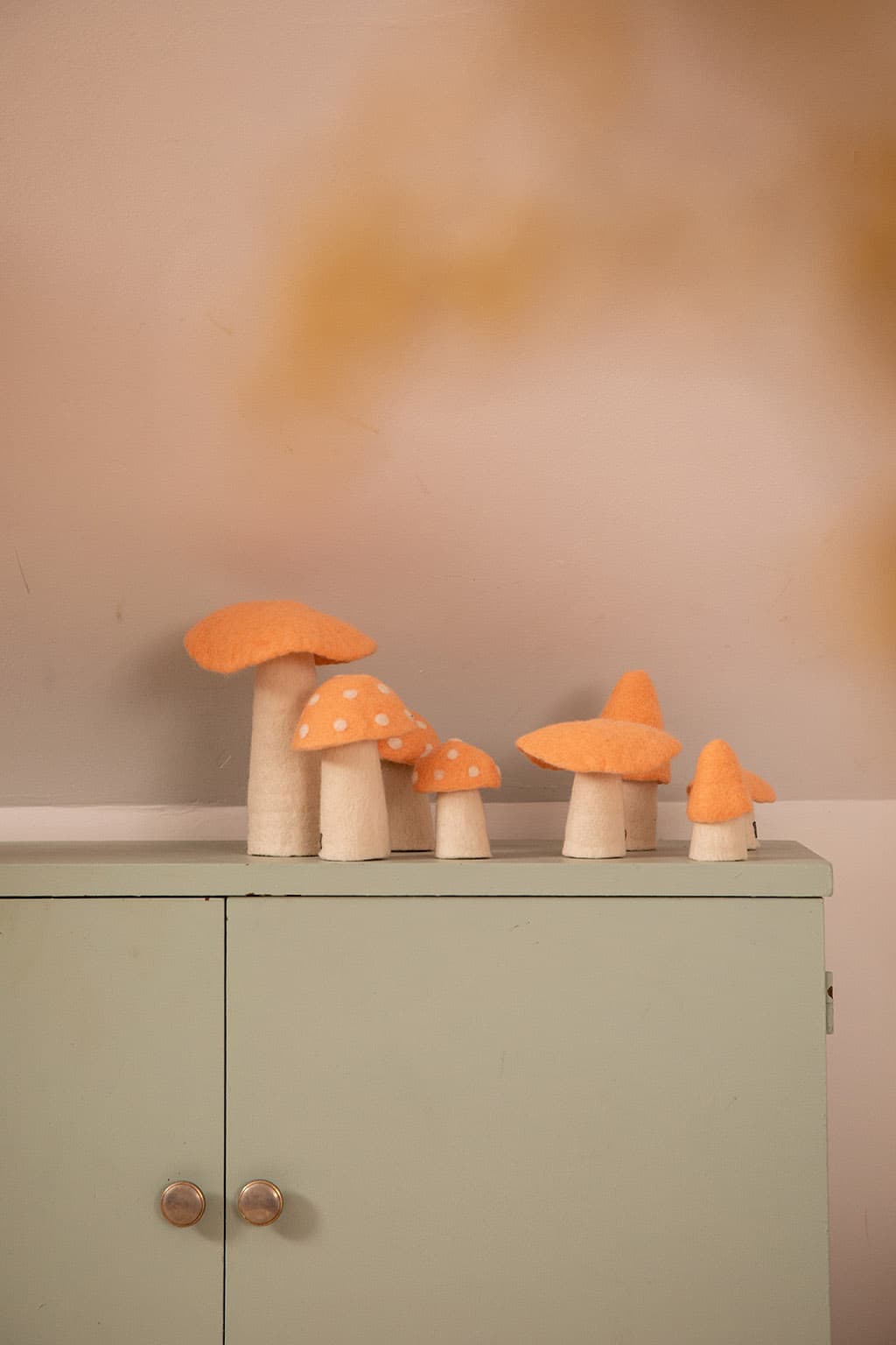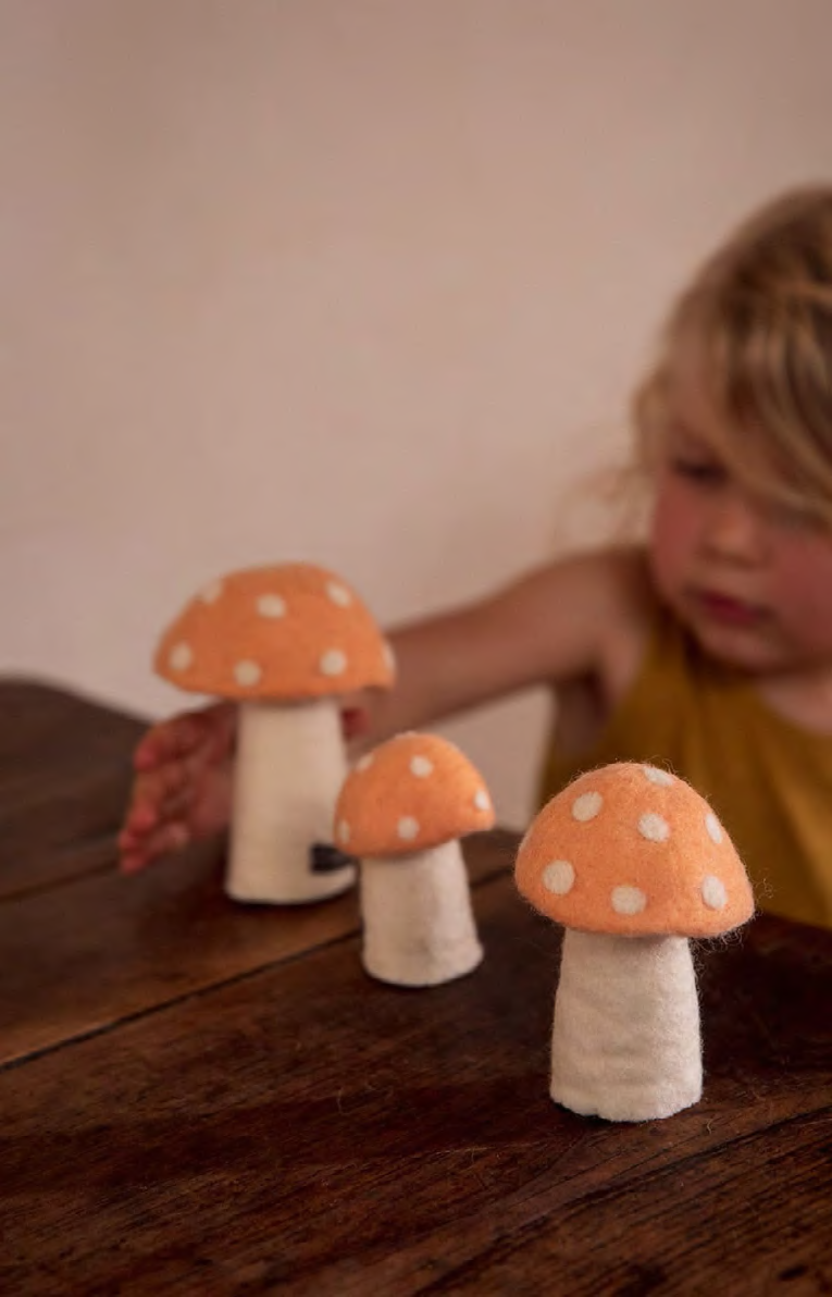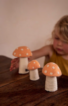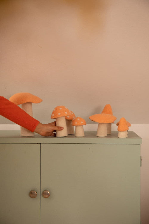 The felt Mushroom is the star of the collection, a must-have in the home! Whimsical and fun, a decorative touch the whole family will enjoy. The mushrooms are cute in children's bedrooms, in the library, or on top of a dresser or occasional table.