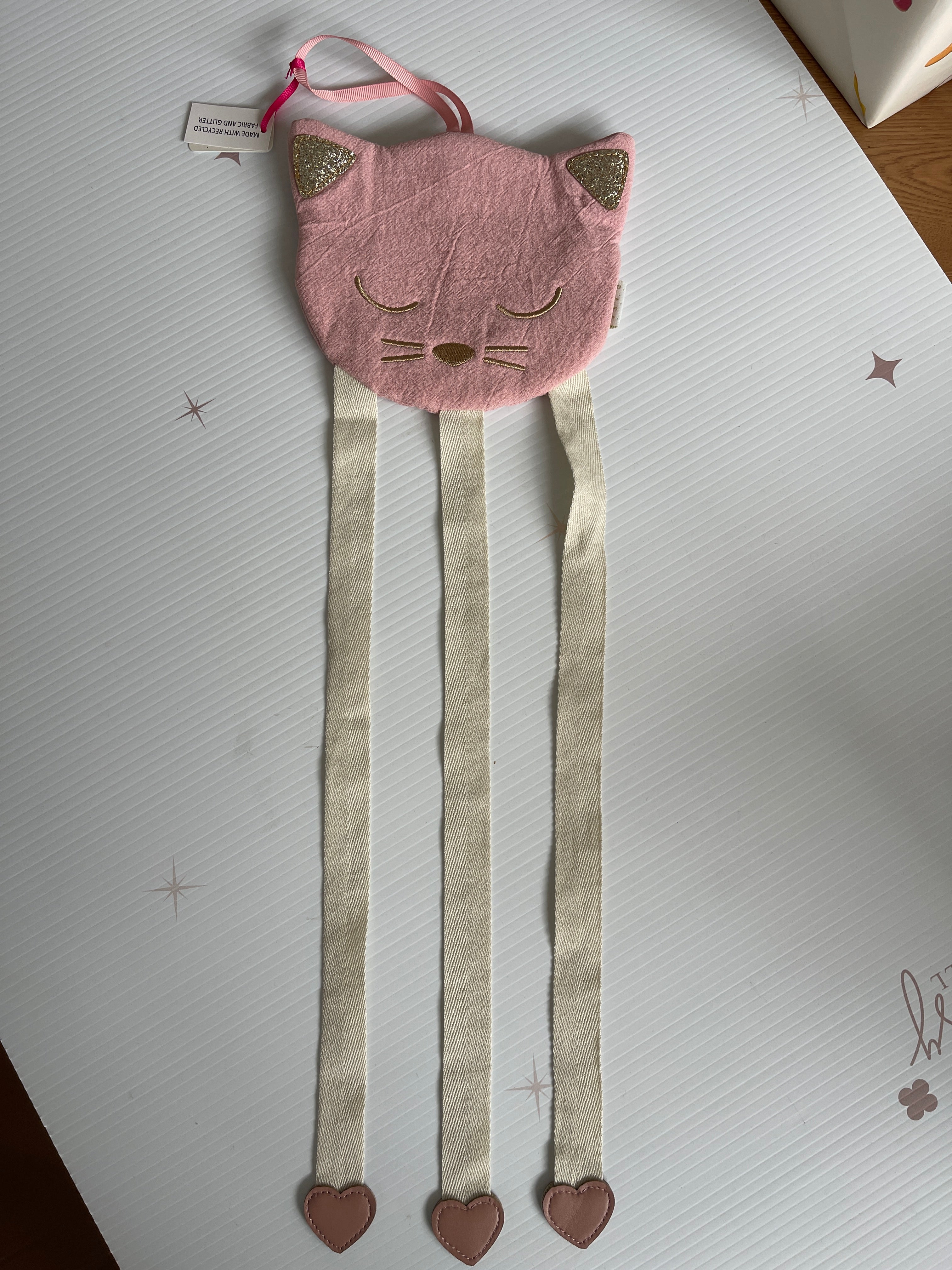 The perfect solution for keeping hair clips safely stored in one place! This clip hanger is made out of super soft dusky pink fabric and has a sweet face and glitter ears! With three hanging strips attached, our Clara cat hanger can fit around 39 clips (depending on clip size) and has additional storage space as Clara is also a hidden pouch!