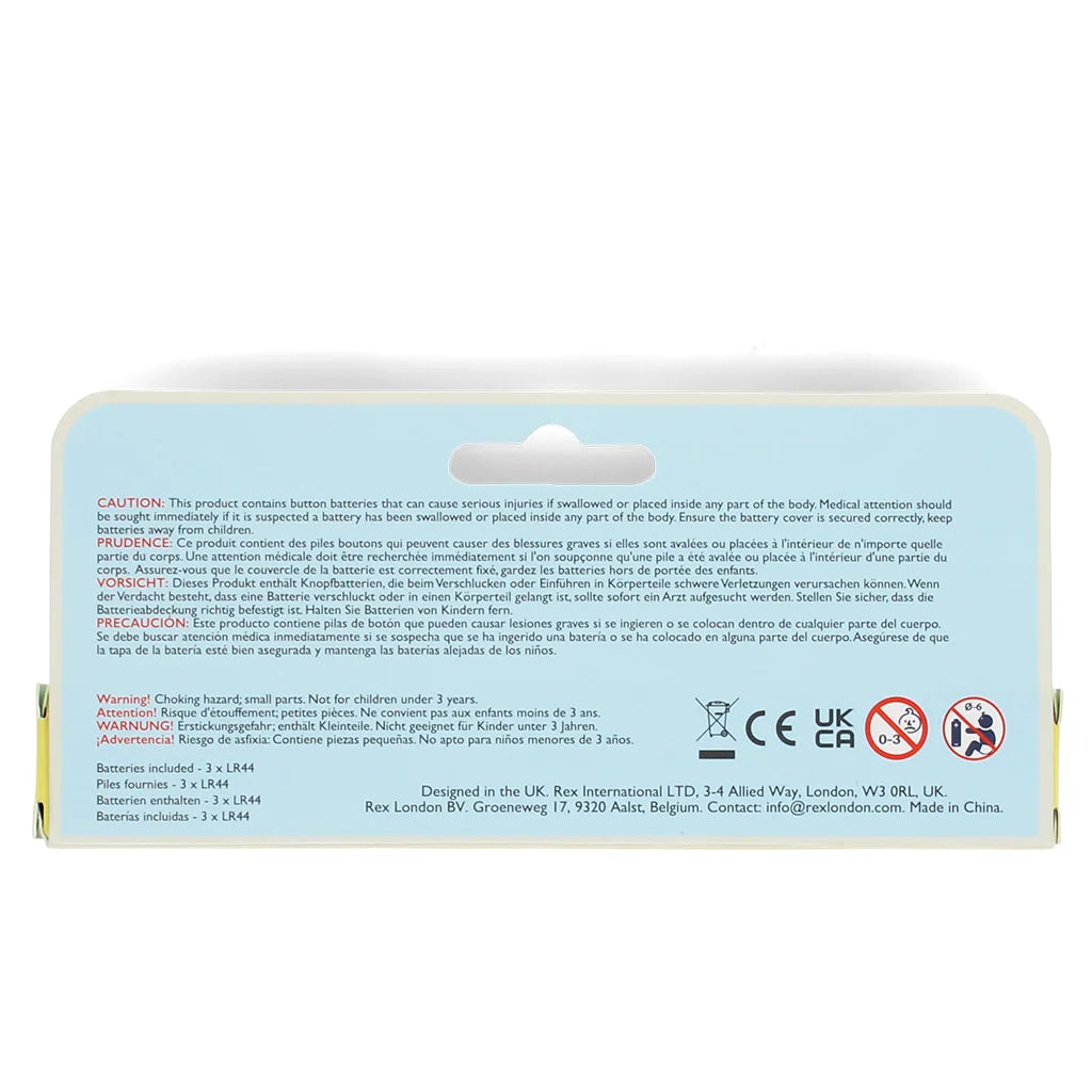 Warning! Choking hazard; small parts. Not for children under 3 years. This toy contains batteries that are non-replaceable. Button batteries can be easily swallowed and can cause serious harm. If you think batteries might have been swallowed or placed inside any part of the body, seek immediate medical attention. Dispose of used batteries immediately. Keep batteries away from children. Important information and instructions regarding batteries can be found on the packaging. This must be retained for future reference.