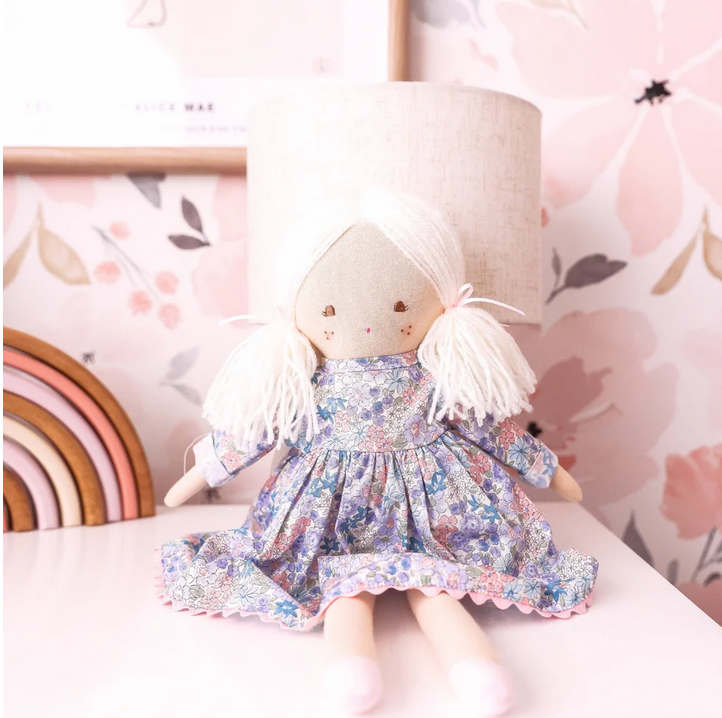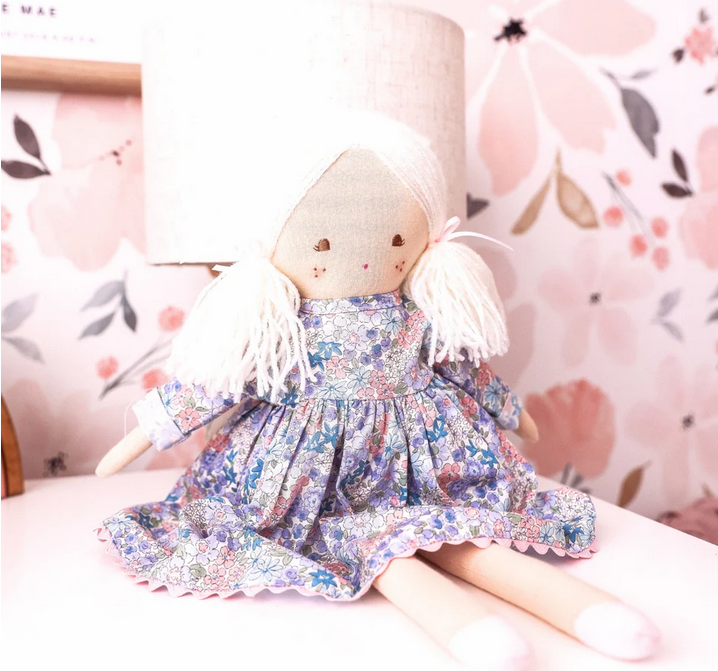 Meet Matilda in Liberty Blue, a classic beauty dressed in a dreamy floral print that feels straight out of a storybook. With soft yarn pigtails tied in sweet bows, rosy cheeks, and a gentle embroidered smile, Matilda is crafted to be loved, cuddled, and cherished for years to come.