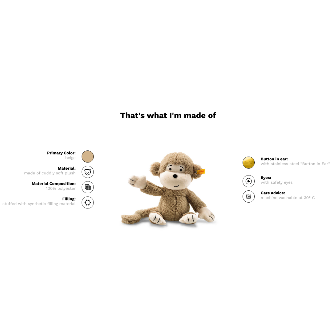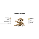 Brownie monkey measuring 30 cm can climb anywhere. His mouth has such a beautiful smile and his raised eyebrows ask what the next adventure is going to be. He is so beautiful to grasp and touch. His face, hands and feet are made of short plush while his fur is made of longer cuddly soft plush. The different surfaces are great for baby to feel and touch to develop fine motor skills.