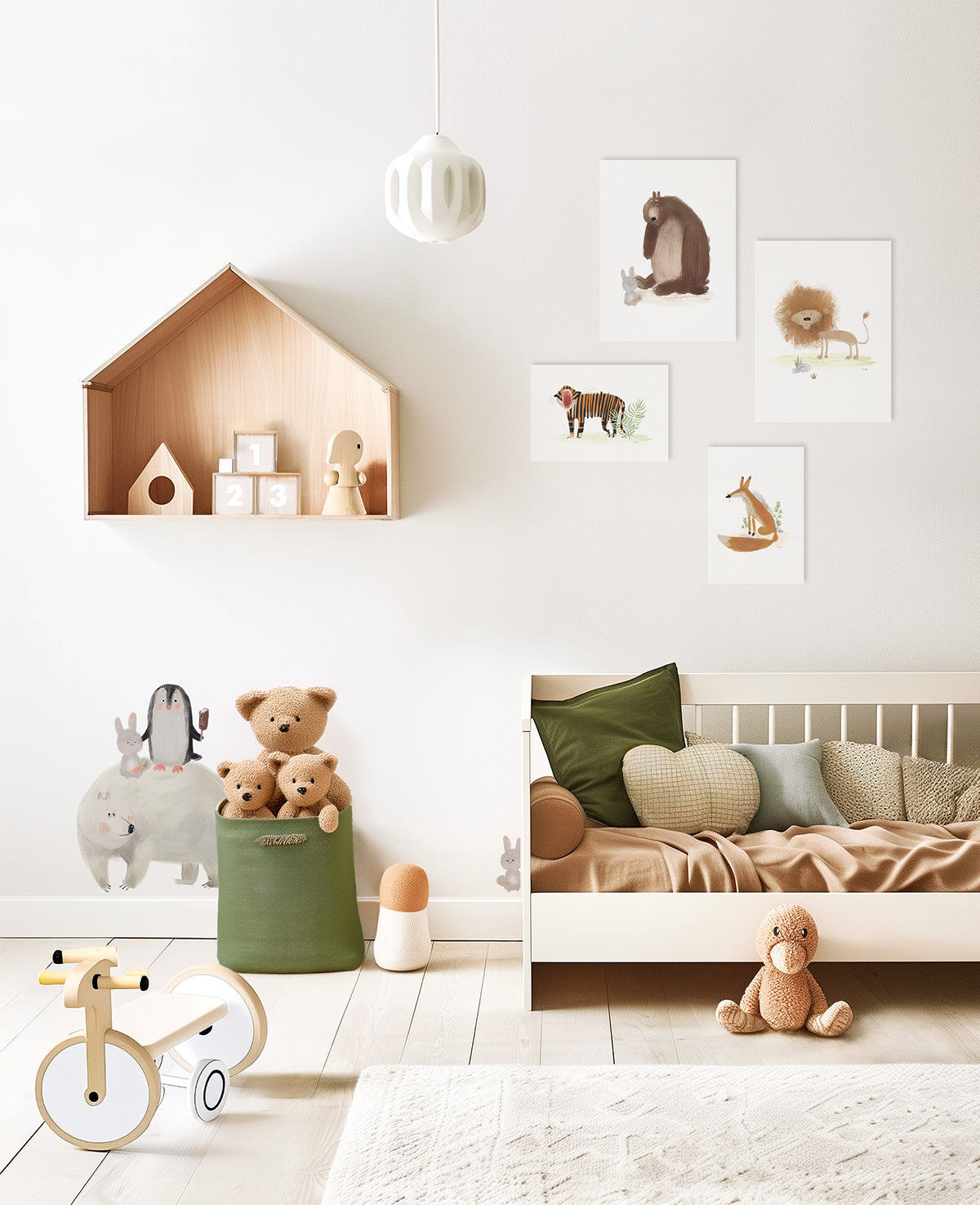 A vibrant fusion of illustrated animal portraits, each brimming with humor and charm, designed to infuse your kids interiors with life and laughter.