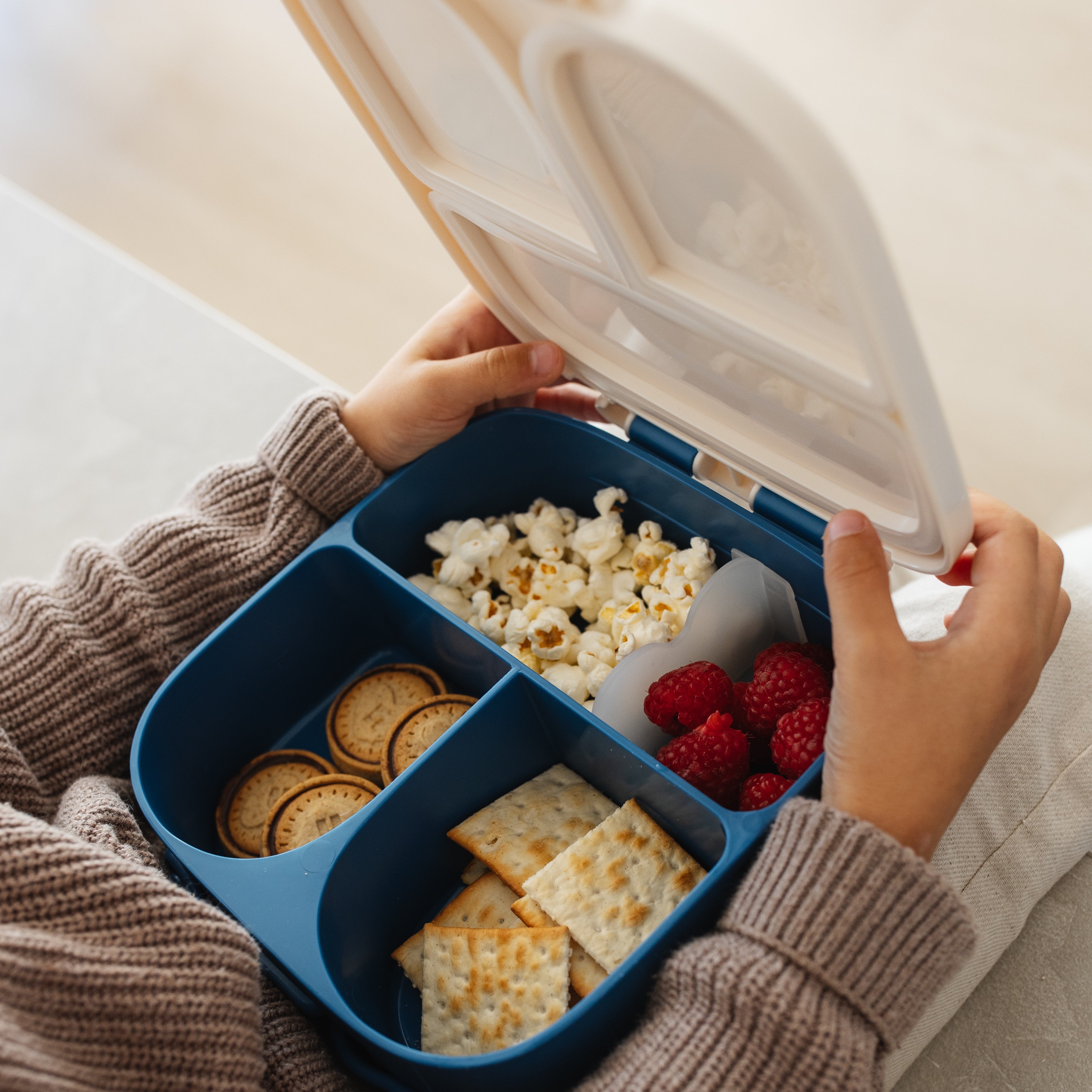 This leak free bento box has 3 compartments. The lunch box can also be used without the compartment divider. Easy click and close lid + silicone handle.