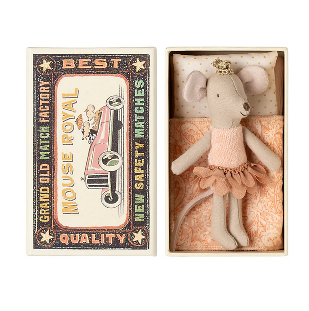 The royal twin mice is a set of a small princess and prince. They wear golden crowns and beautiful clothes. They sleep in a lovely decorated matchbox with a picture of themselves on the front. Inside the box you find the softest beddings.