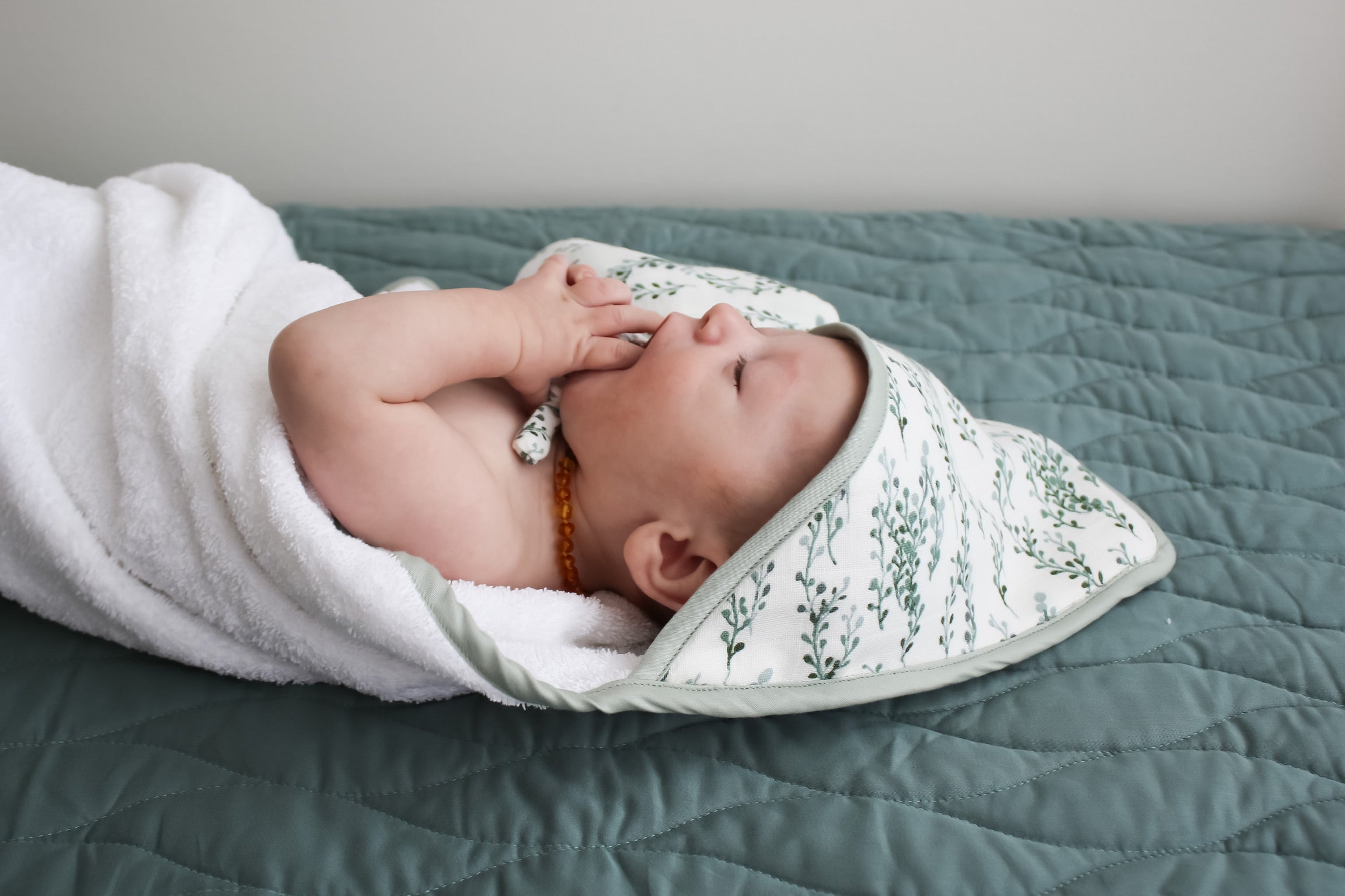 Our new String of Pearls print features delicate strands of pearls in gorgeous forest green on a classic off-white background. The towel is bound in soft sage green.