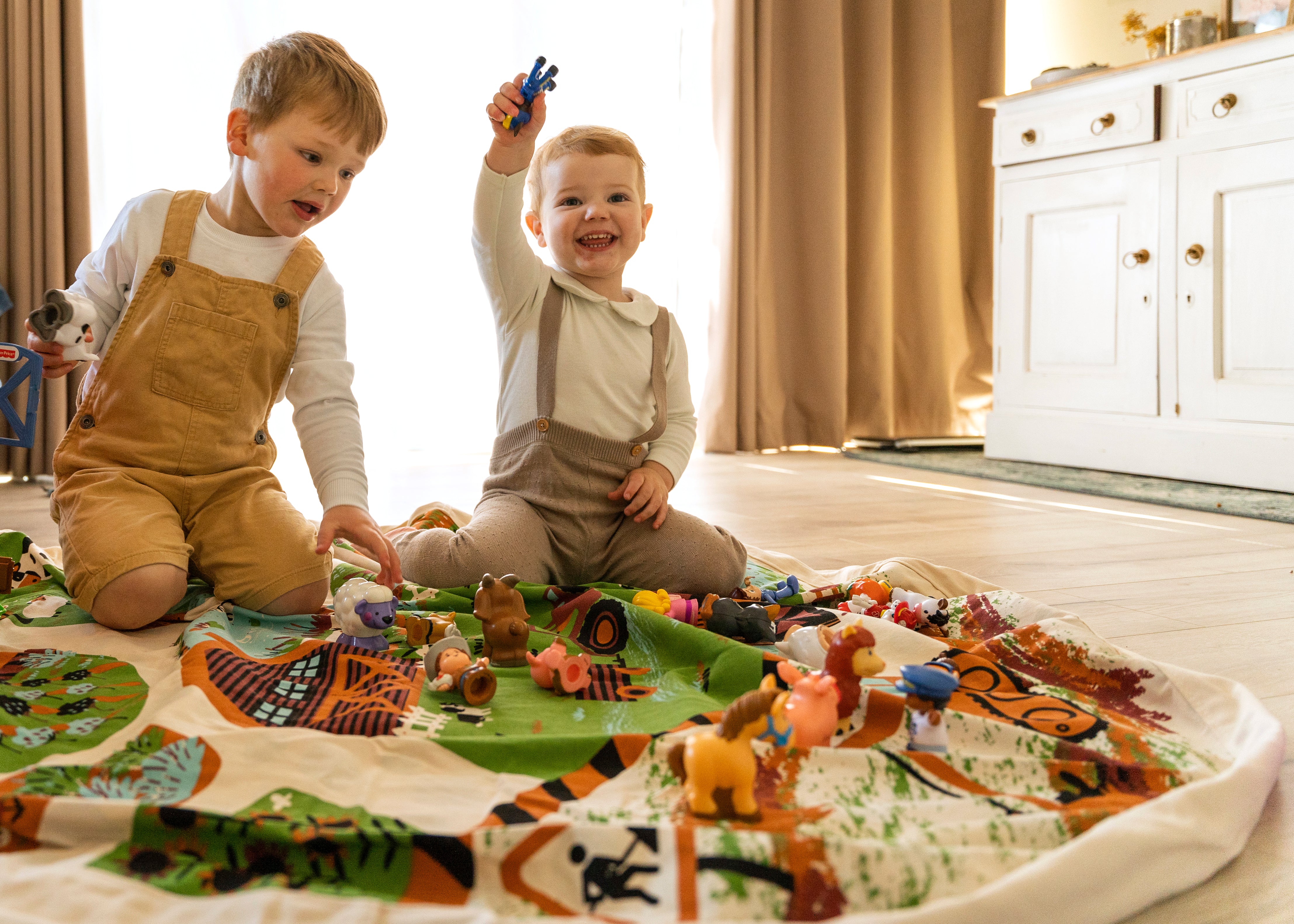 Spread the Play Pouch out for play and all the bits and pieces stay together. When it is time to pack away, just pull on the rope and in a jiffy you've gathered everything neatly into the Play Pouch.