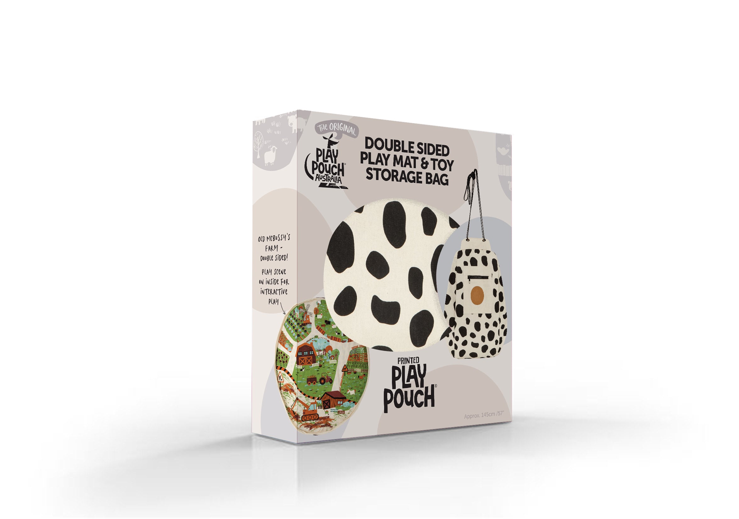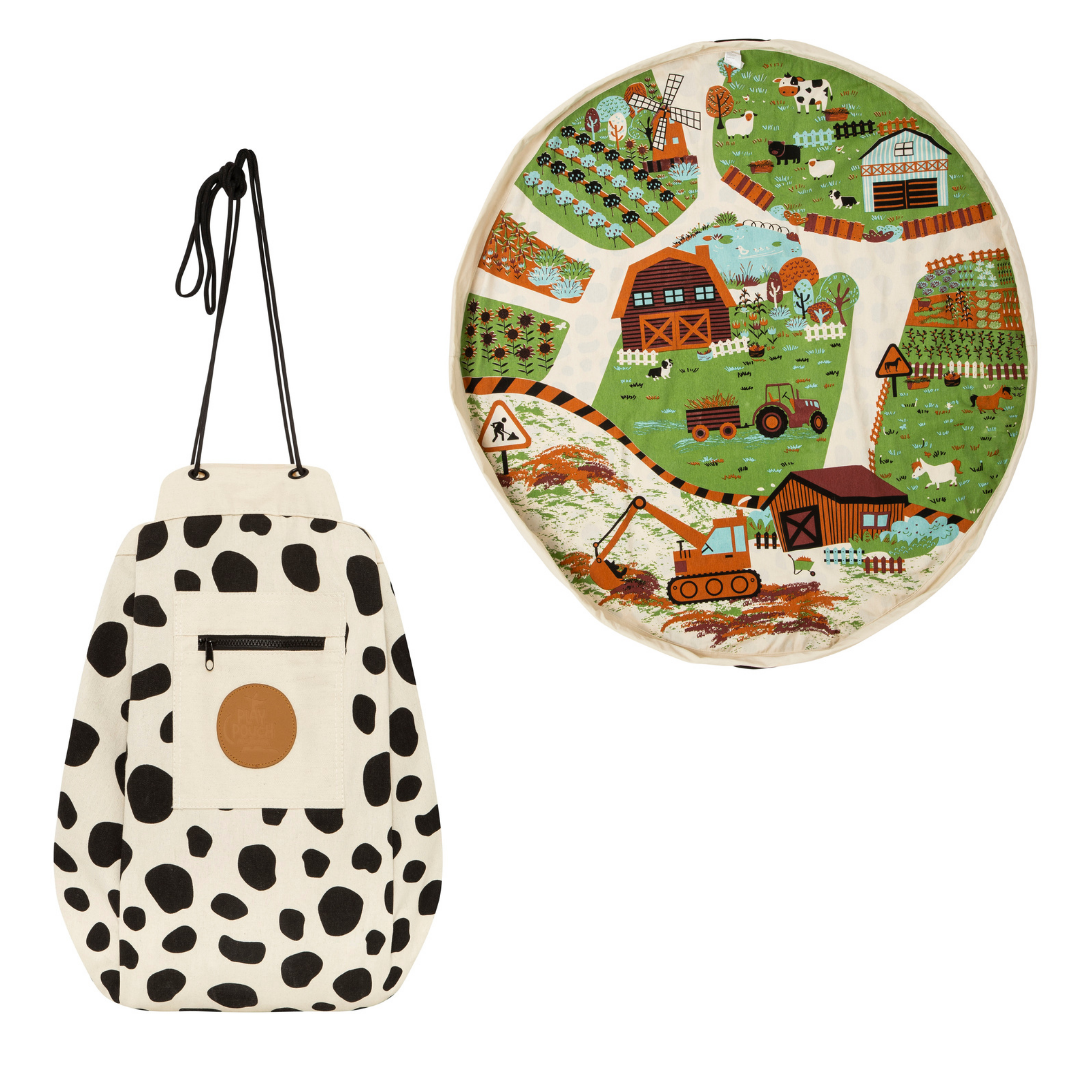Old McBussy's Farm Play Pouch encourages imaginative play, with a playful cow skin inspired print on the outside, and a beautiful farmyard and digger scene on the inside to encourage hours of imaginative play!