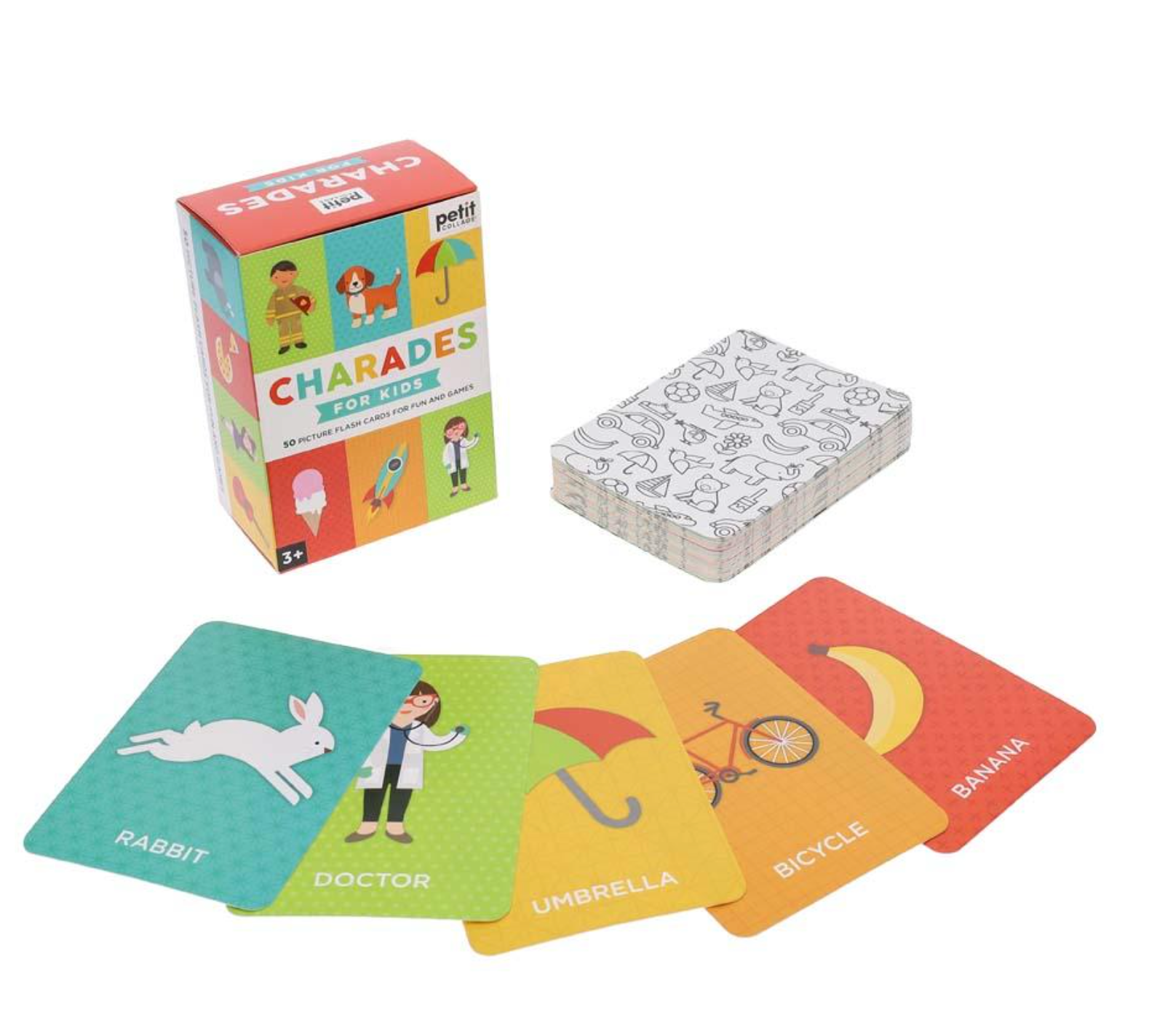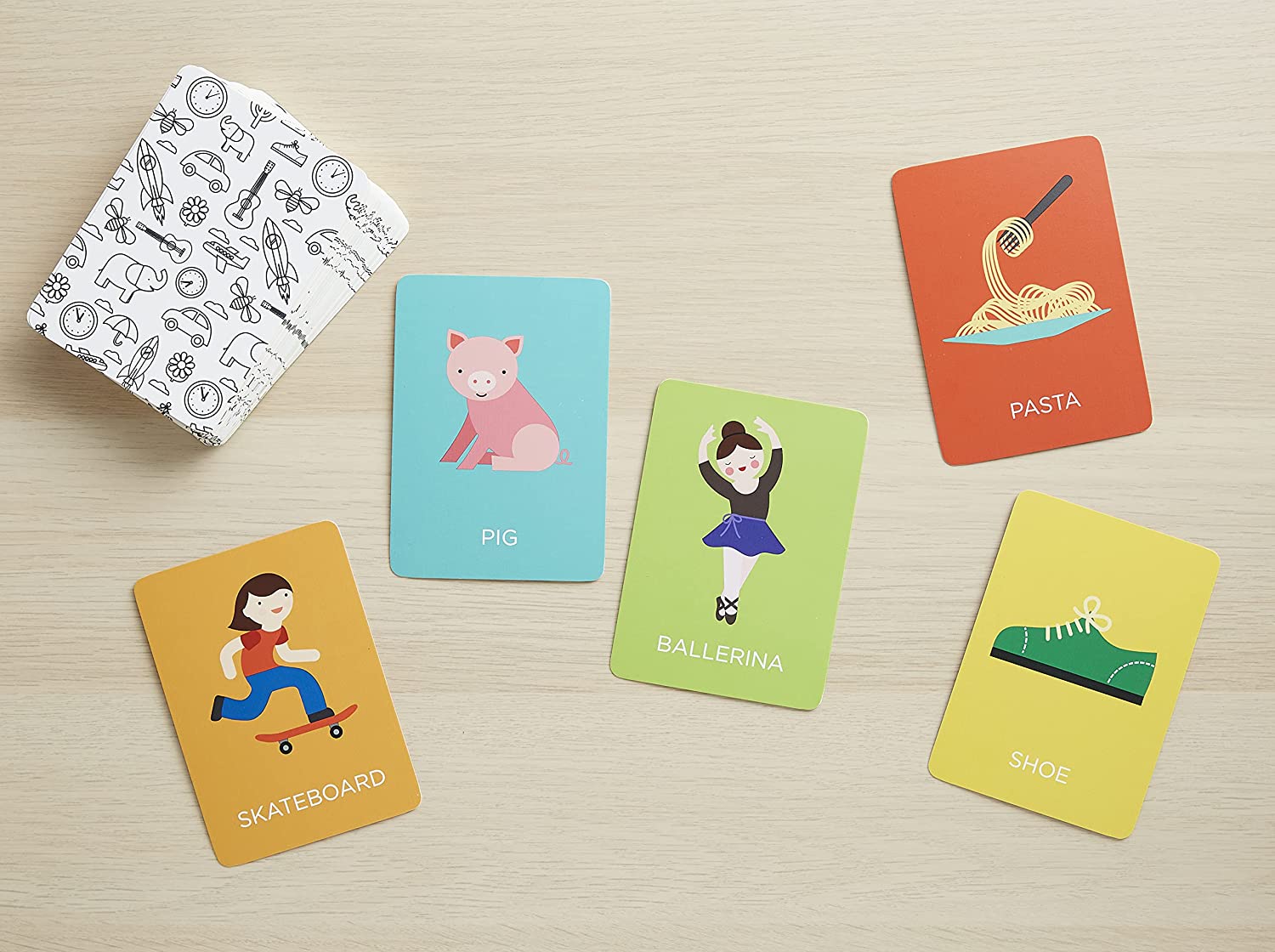 In Charades for Kids, take it in turns to act out the picture for the other players – and whoever guesses what’s on the card wins it! Actions and noises are allowed – but no words! Act out prompts from 5 categories: Everyday Objects, Animals, On the Go, Jobs, and Food.
